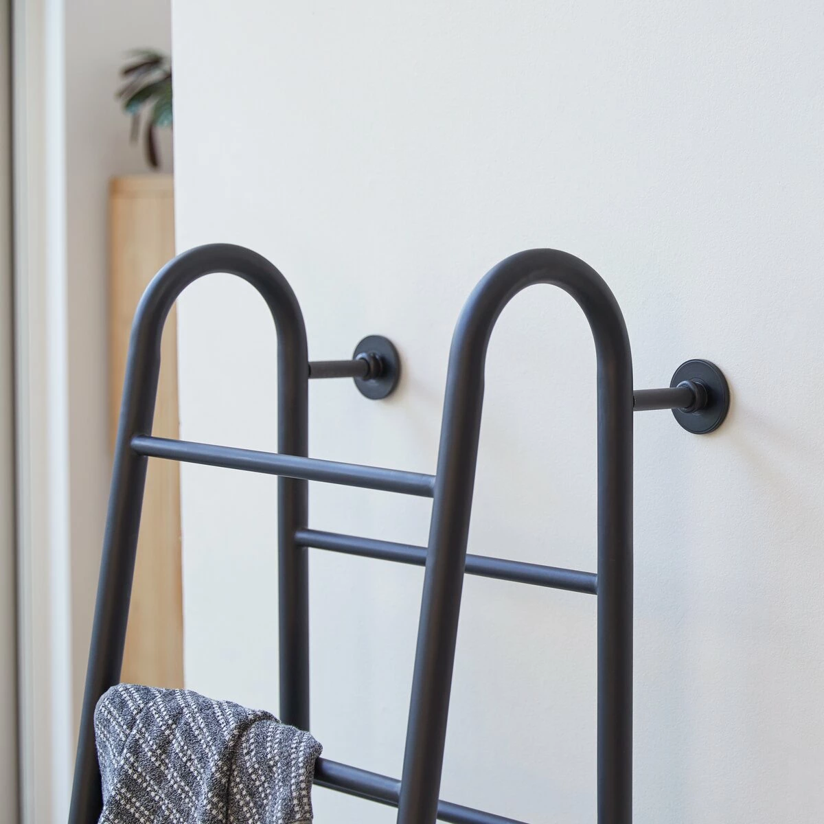 The industrial-inspired Adja metal towel rack combines contemporary elegance with originality. This very functional rack will hold hand towels, bath towels and bath mats – each on its own rung! Compact, but with plenty of space, it can be used in a or cloakroom, or can be reappropriated as a place to hang coats in an entrance hall, as a valet , or even as a magazine rack or as a place to hang ties or scarves. Get creative!