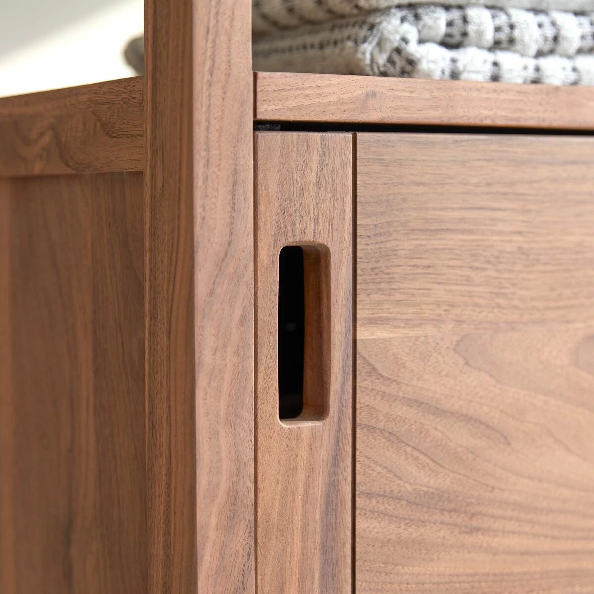 The Arty solid FSC® walnut storage unit offers contemporary elegance. It is well designed and will complement the as well as your existing furniture. We like the warm, rich colours of the wood with its beautiful grain, as well as the understated design. The clever structure allows you to conceal or display as you please. For example, you could put a basket for dirty laundry in the little cupboard, or store make-up remover pads or towels. On the shelves, you can keep the sort of things you like to have within easy reach or display pretty bottles, your best towels or favourite ornaments. It is delivered ready oiled to resist water, and the wood is FSC® certified, which means that it is sourced from sustainably managed forests.