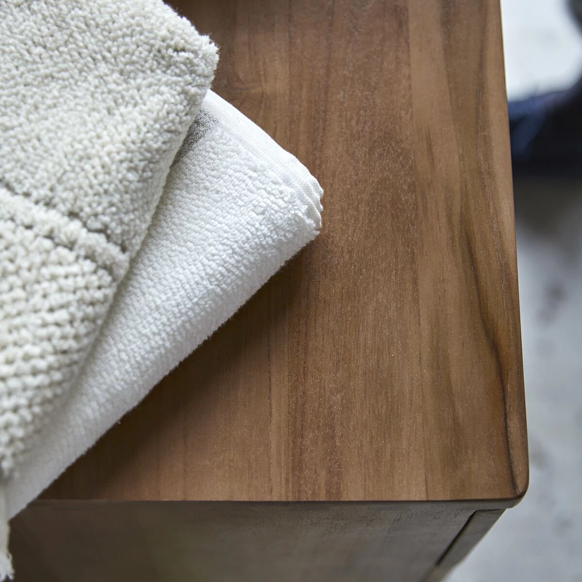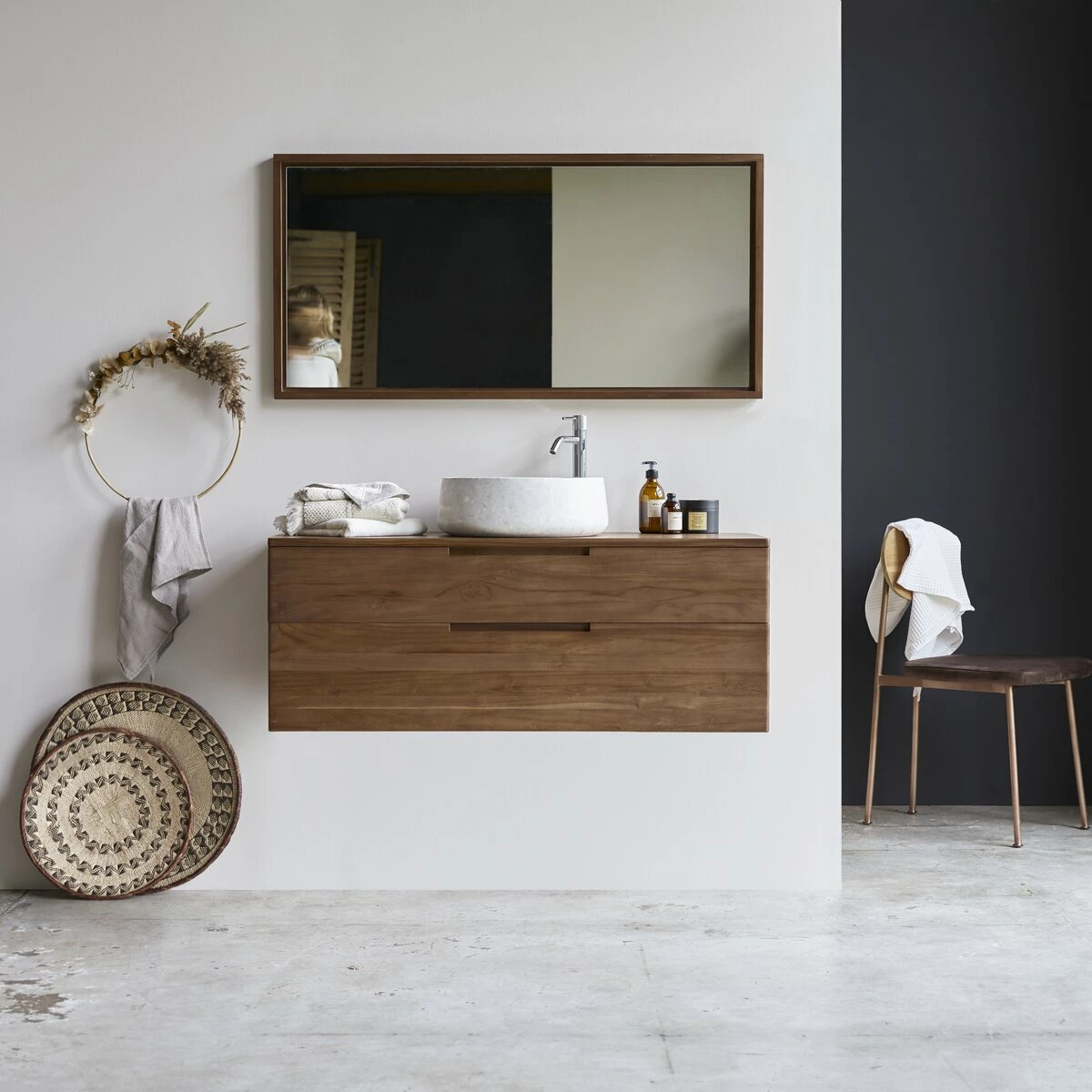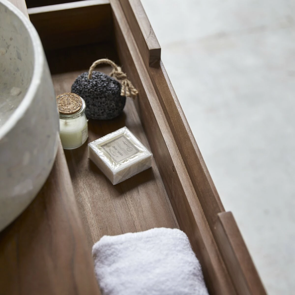 The Baker washstand by Karpenter! Designed to withstand moisture, it features two large drawers that accommodate towels, rugs, shampoos, toothbrushes … in short, everything you don’t want to see cluttering your bathroom. The simple design gives it a decidedly contemporary look. The natural graining of the teak, meanwhile results in a charming and authentic wood look. Worked out of FSC® certified wood that meets the standards of sustainable forest management, it has plenty of space for storing your accessories. Note the drawer dividers, which are very practical and take the place of handles.
