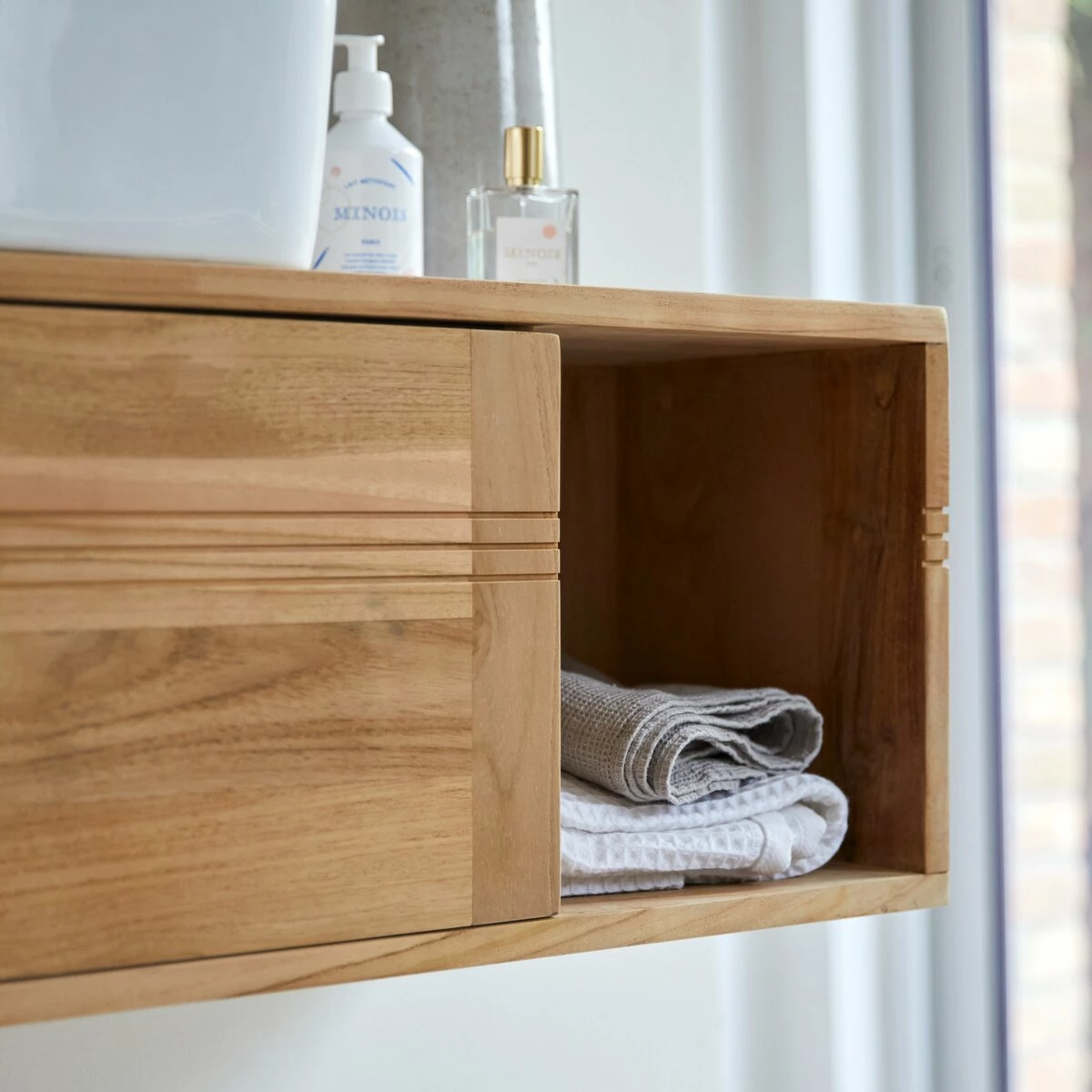 This elegant in FSC® certified slid teak will delight yu with its simple style. It can easily find its place in , due t the, space saving, wall munted design.