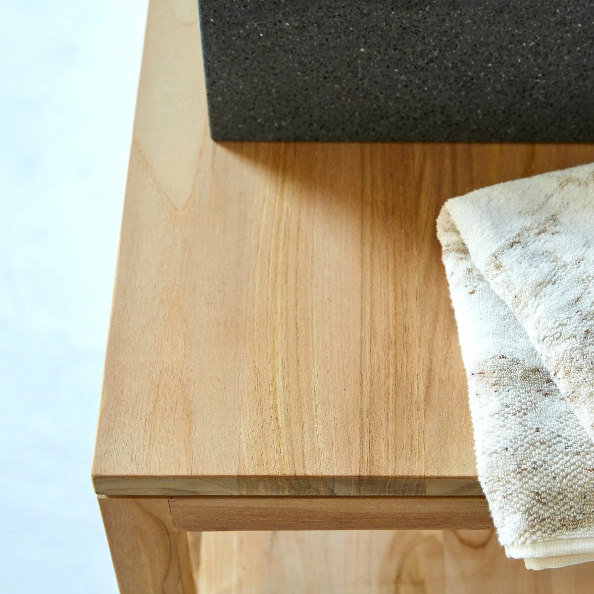 On the practical side, everything can be kept tidy and organised on the shelves and in the 2 cupboards (sliding doors). The blond teak brings warmth to all bathrooms and laminated wood. It can awaken and invigorate your bathroom.