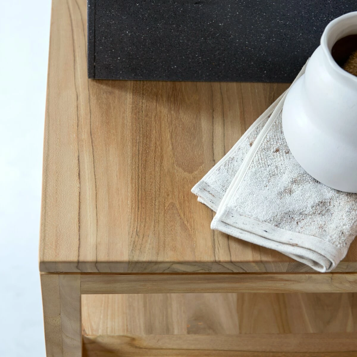 The Colonial 90 in FSC® certified solid teak bathroom vanity cabinet combines the warm colour tone of the solid teak with the personality of the latticed wood design.
