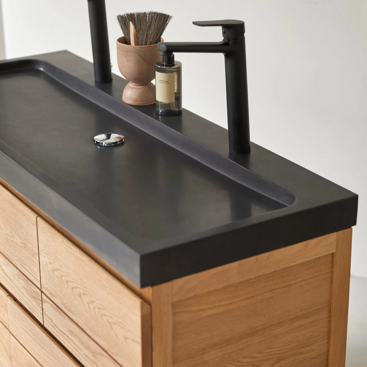 Discover the Easy Duo solid oak FSC® certified and lava stone washbasin. The cupboard has 2 drawers that allow you to store all your essentials, such as linens and cosmetics. Thanks to its large sink unit, this piece is ideal for for a family or couple who need to use the bathroom simultaneously. Its elegant design is characterised by clean lines and a sophisticated, contemporary design that will give your home a warm, modern look.