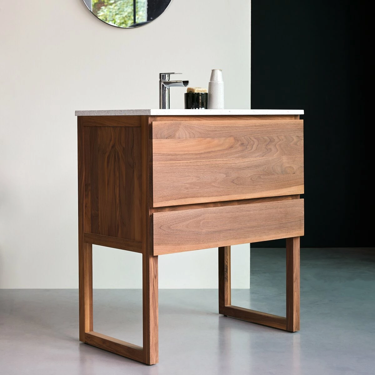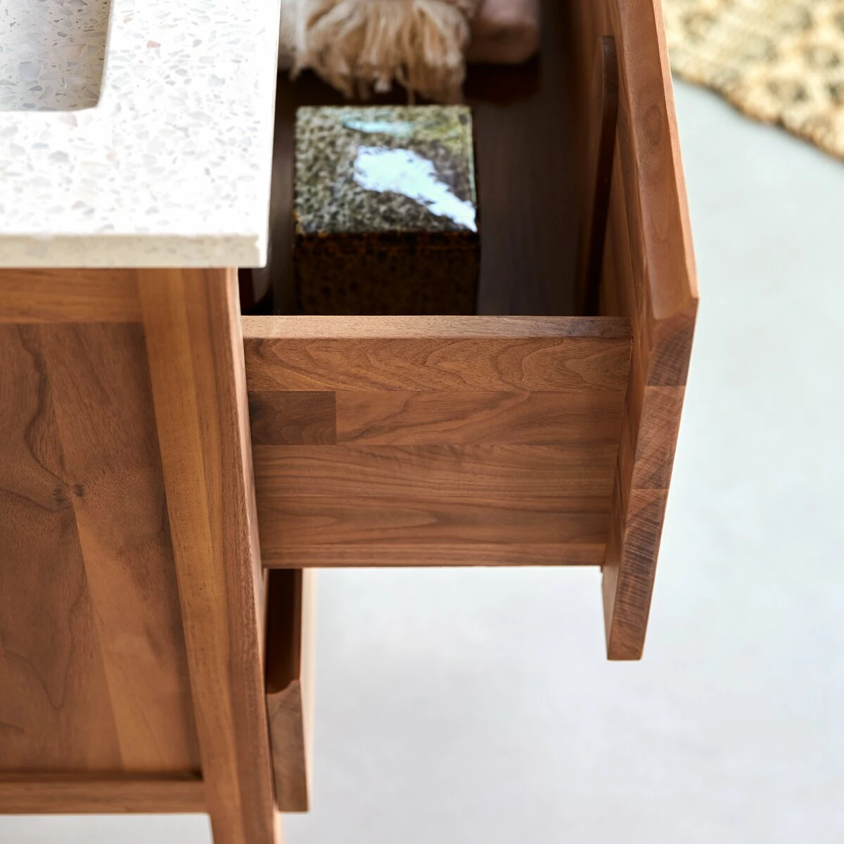 The Edgar vanity unit in solid walnut and Moon premium terrazzo is also available in . We also offer it combined with a ceramic basin or a premium terrazzo basin. It is also available in solid teak, combined with different basins: explore our entire .