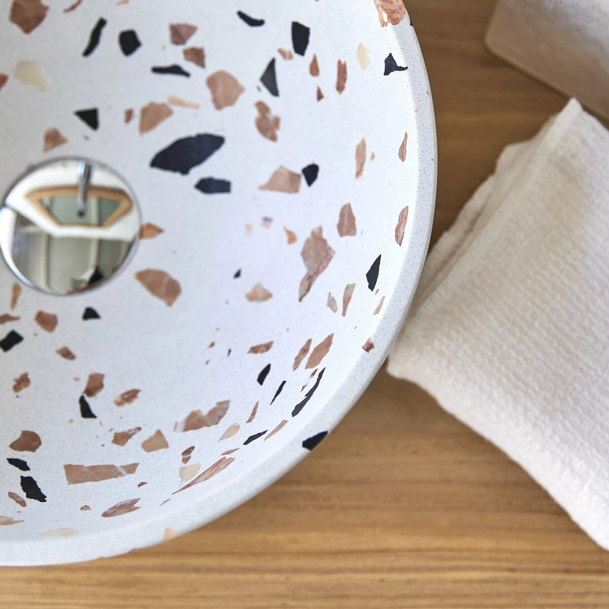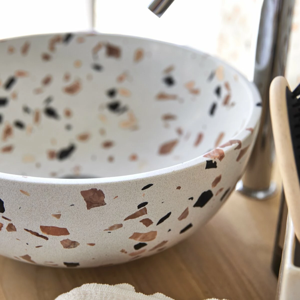 Crafted from a high-quality material composed mainly of marble, the eye-catching round basin in brown will instantly modernise any bathroom – what more could you wish for?! You’ll love its hard-wearing varnished material, which is resistant to scratches and to the natural wear and tear of everyday life and can be wiped clean simply with a damp sponge. Visually stunning, this pretty basin draws its inspiration from tableware and has a truly original design! Neither so big that it takes up too much space nor too small to be impractical, its size has been designed to fit easily into any bathroom or cloakroom. Why not create a harmonious shower room by adding the matching in brown .