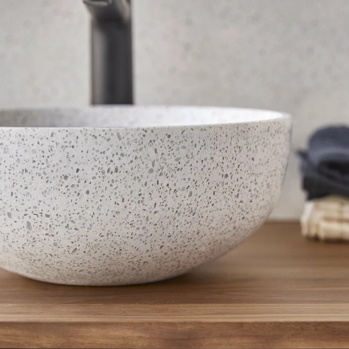 The Elea premium white terrazzo round basin is also available in three other premium terrazzo shades, , and .