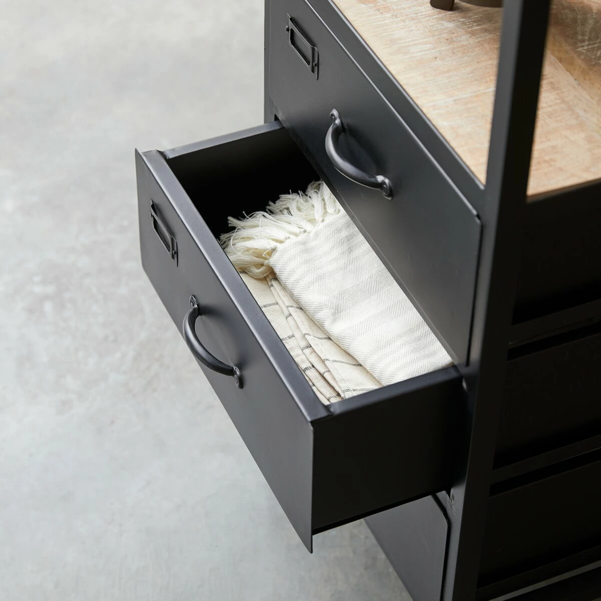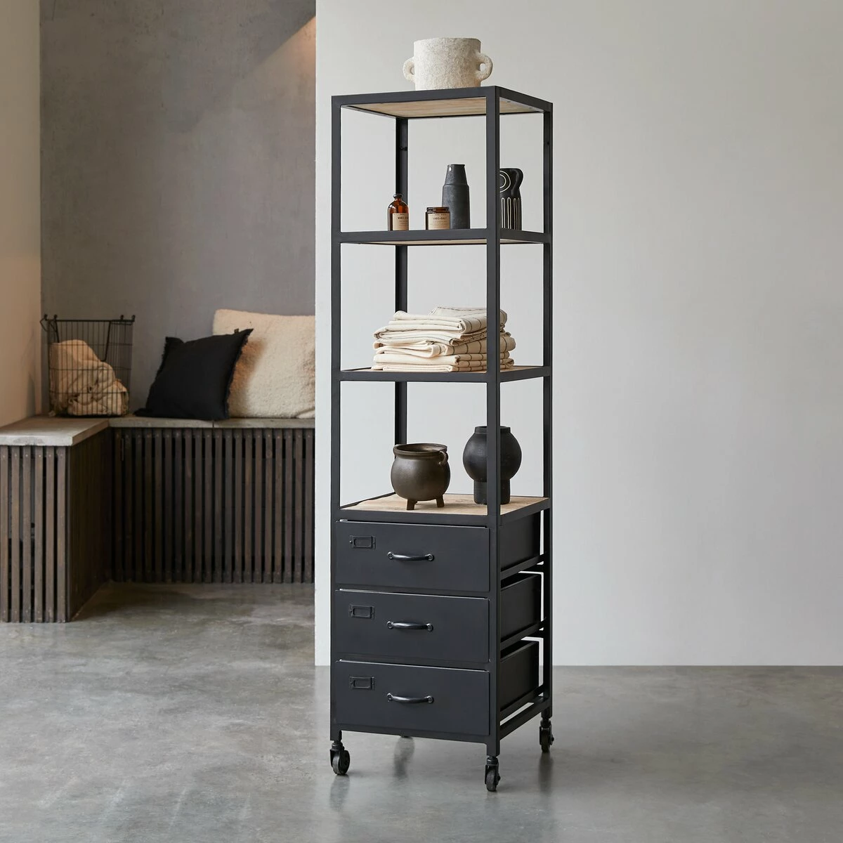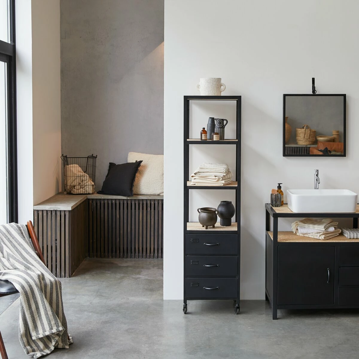 The blend of the mango solid wood and black metal gives the Industrial column cupboard a beautiful workshop spirit. On the shelves, you can place a stack towels, bath mats and beauty products …Meanwhile the drawers can host those little accessories which you never know where to put! Very compact, this cupboard is great for any kind of bathroom!