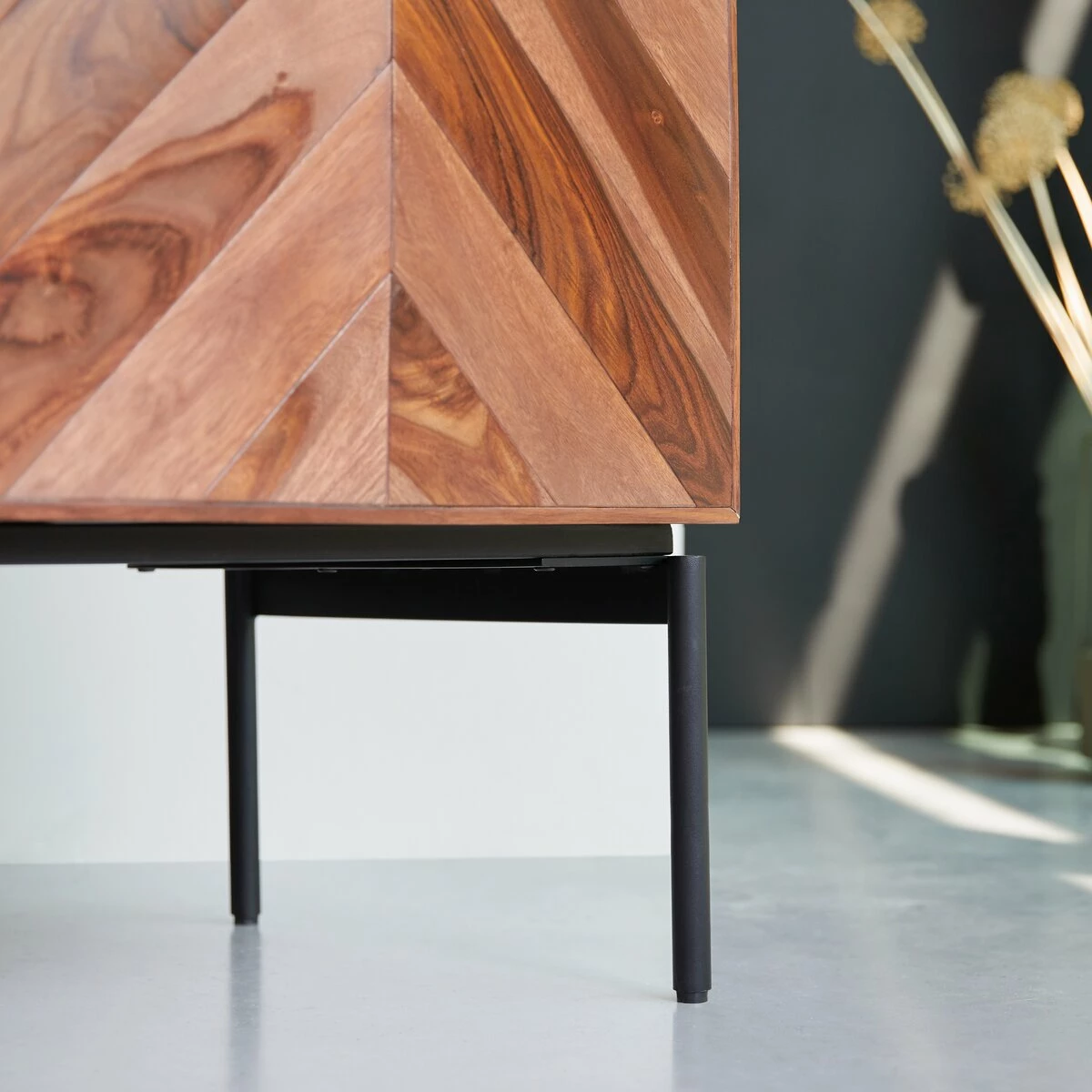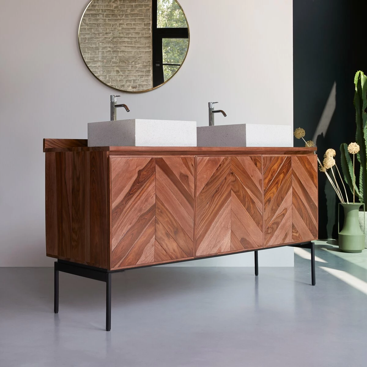 The Ismaël Sheesham vanity unit displays the graphic beauty of a wood with a very visible grain. Its sleek lines enable it to find its place in any style : whether in a classic space or in a room with a more marked style, it will be one of the central decorative elements. Note the thin metal legs, which give it a lightness much favoured in today’s interiors. Its lacquered finish ensures easy maintenance.