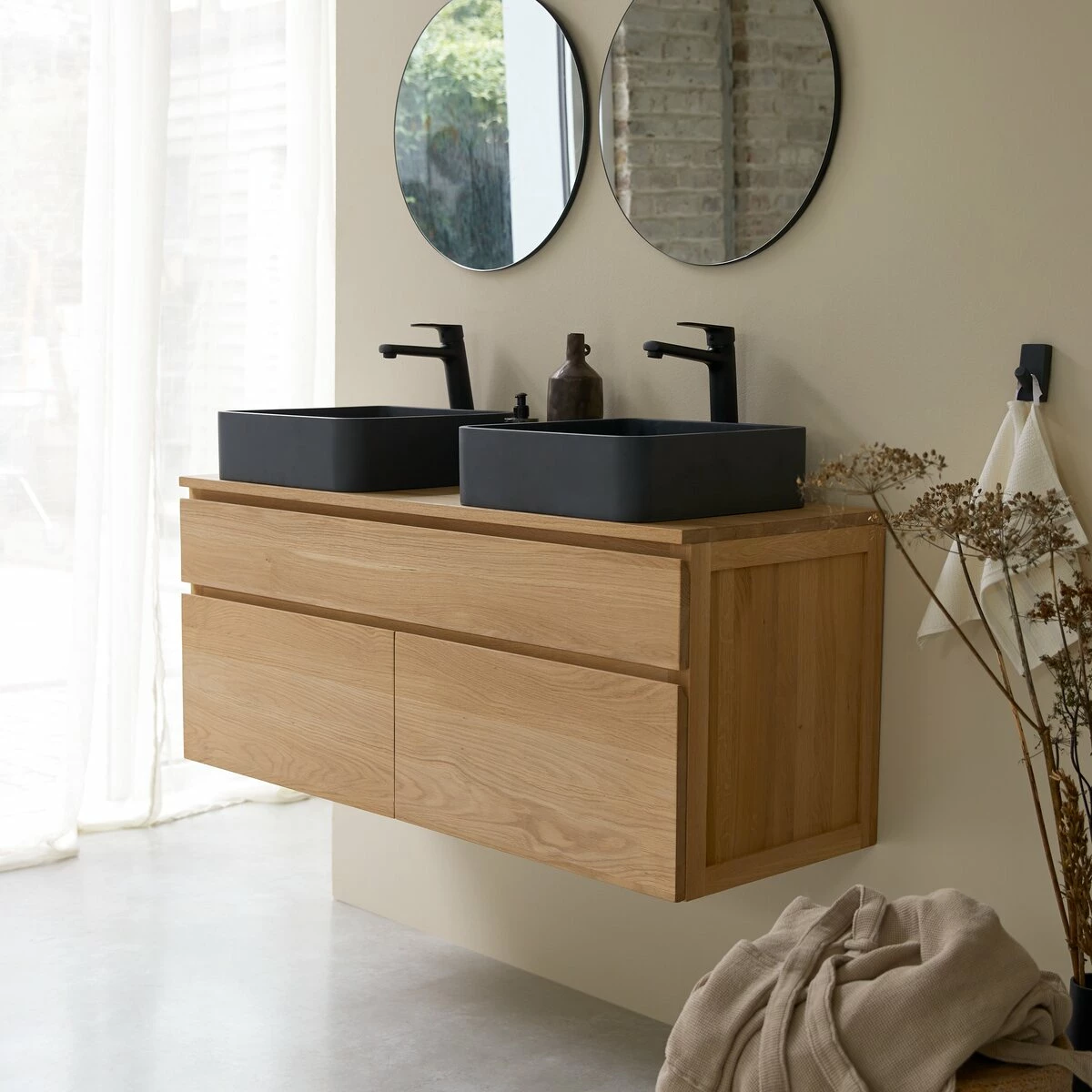 The Jacob Oak wall-mounted vanity unit has the double advantage of taking up no floor space (practical, notably when cleaning the bathroom) and offering a lot of storage space: the two deep drawers can be used for putting towels or big bottles in, the wide drawer, for tissues, wipes, brushes, make-up, etc. Nothing need be left lying around in the bathroom!