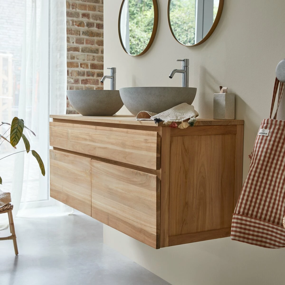 Naturally elegant, the Jacob suspended solid teak wash unit 120 integrates well into . Its two deep drawers can be used to store towels and beauty products. The wide drawer is perfect for accessories such as perfume, brushes and make-up. You will love the clean design and the pale colour of the teak, renowned for its water-resistant qualities. Suspended from the wall, the Jacob wash unit is very practical: you can sweep and mop underneath it easily, which will help ensure your bathroom is always immaculate.