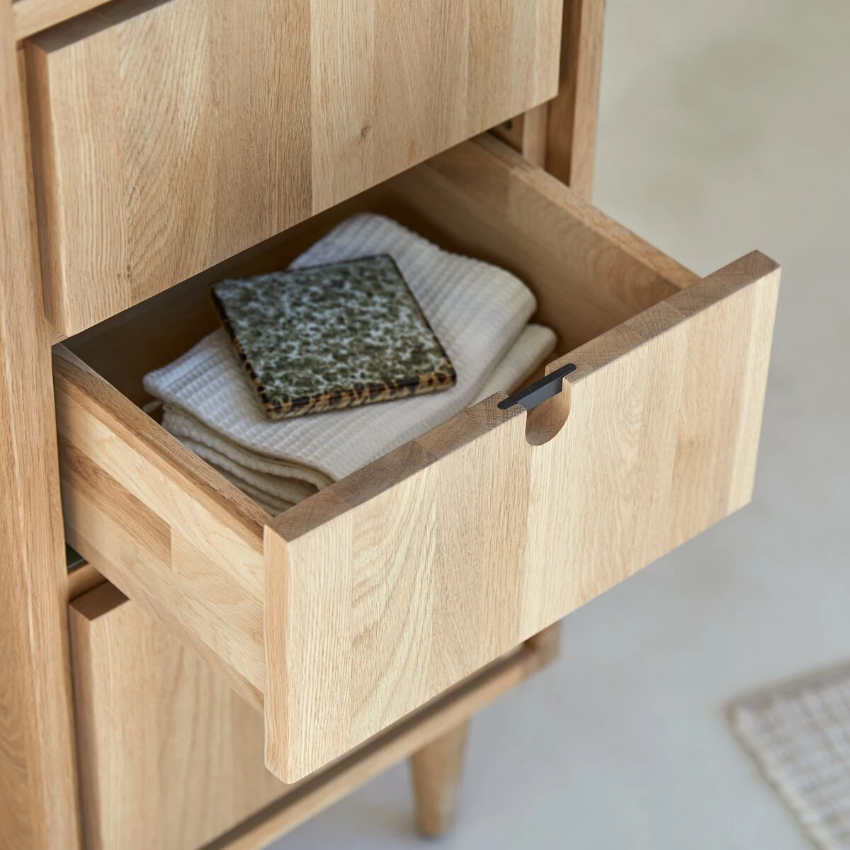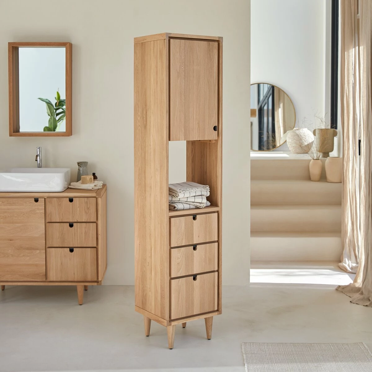 It is the perfect partner for , creating a bathroom that it feels good to relax in every day of the week… The Jonàk tall bathroom unit will also complement your existing decor: its understated lines and the pale colour of the solid wood make it incredibly versatile.