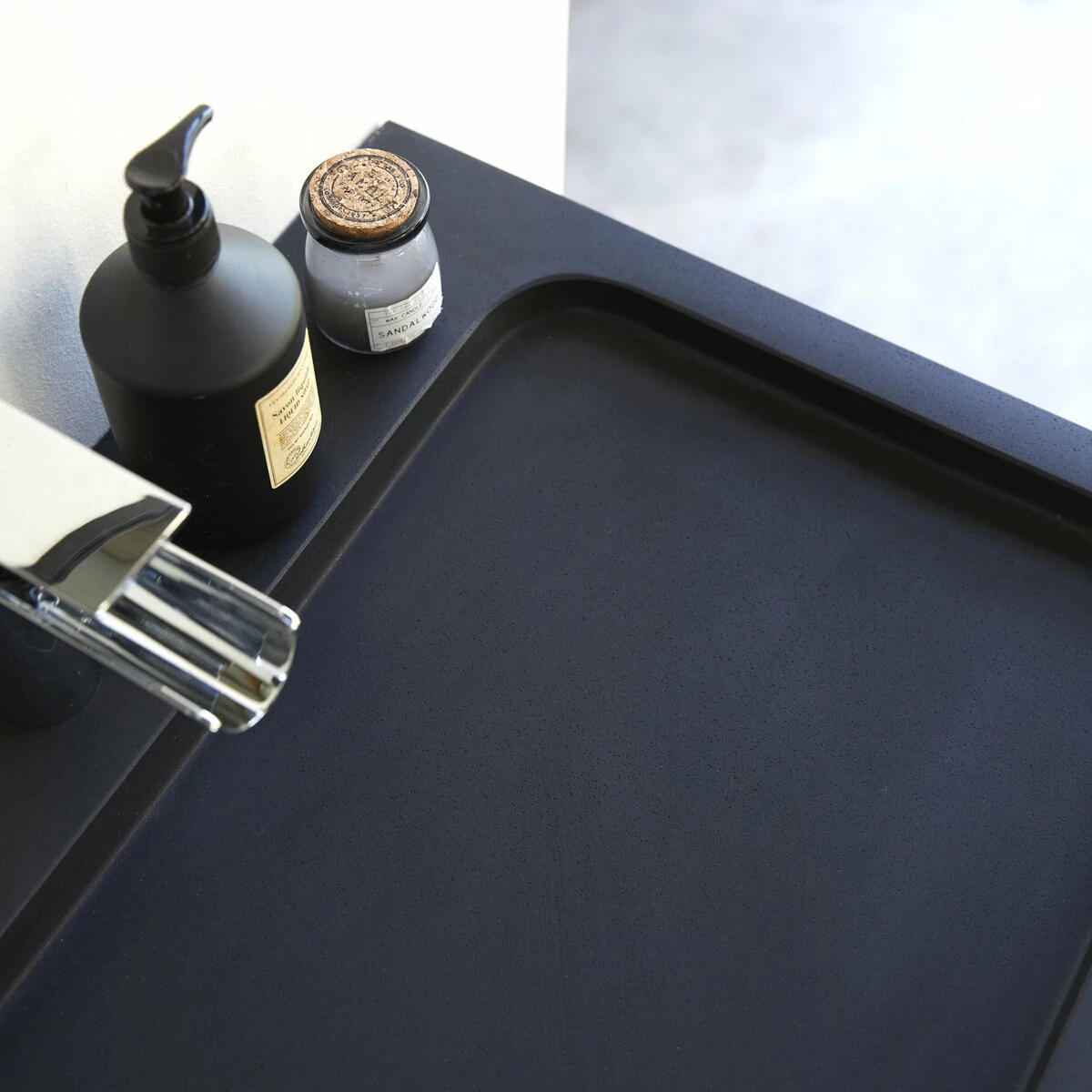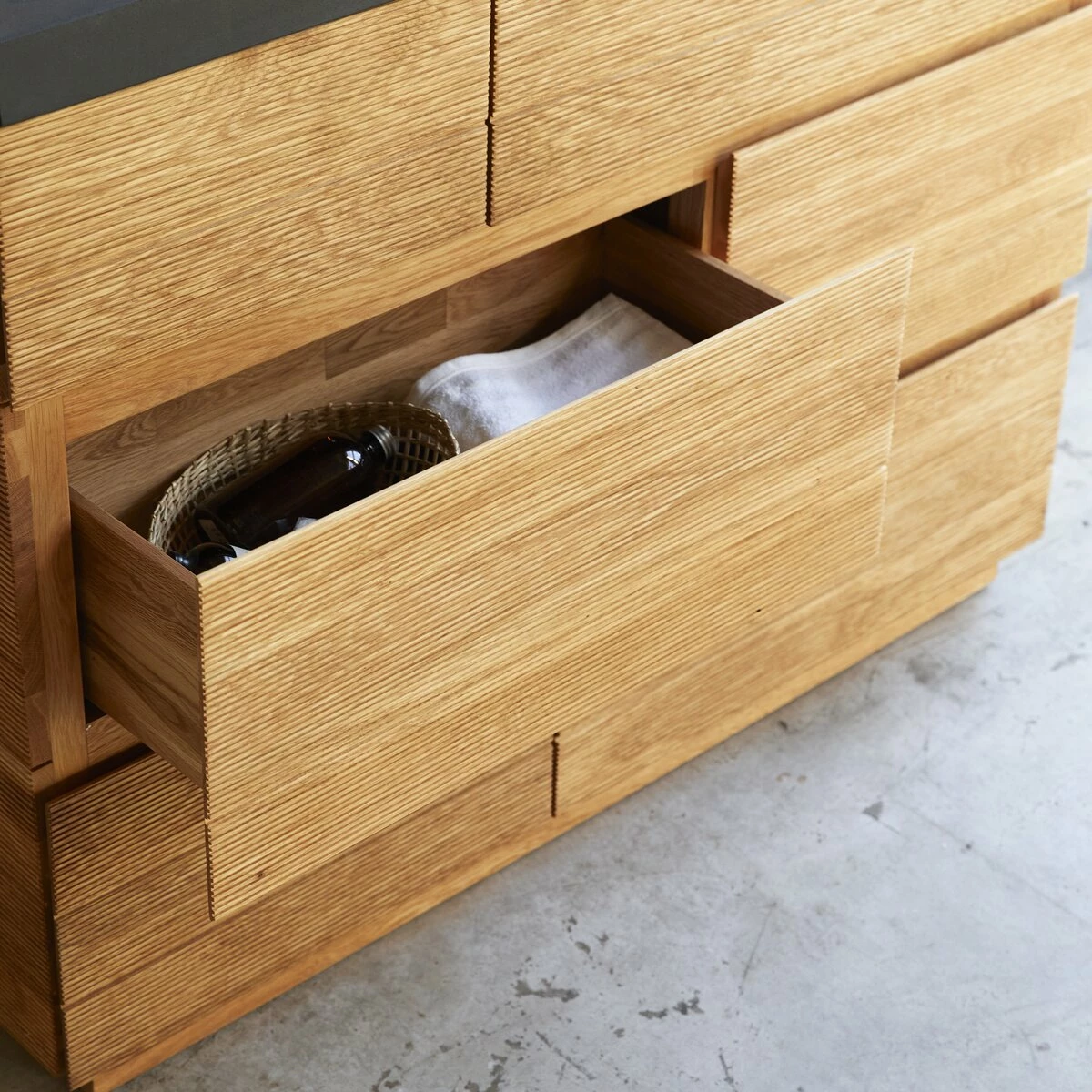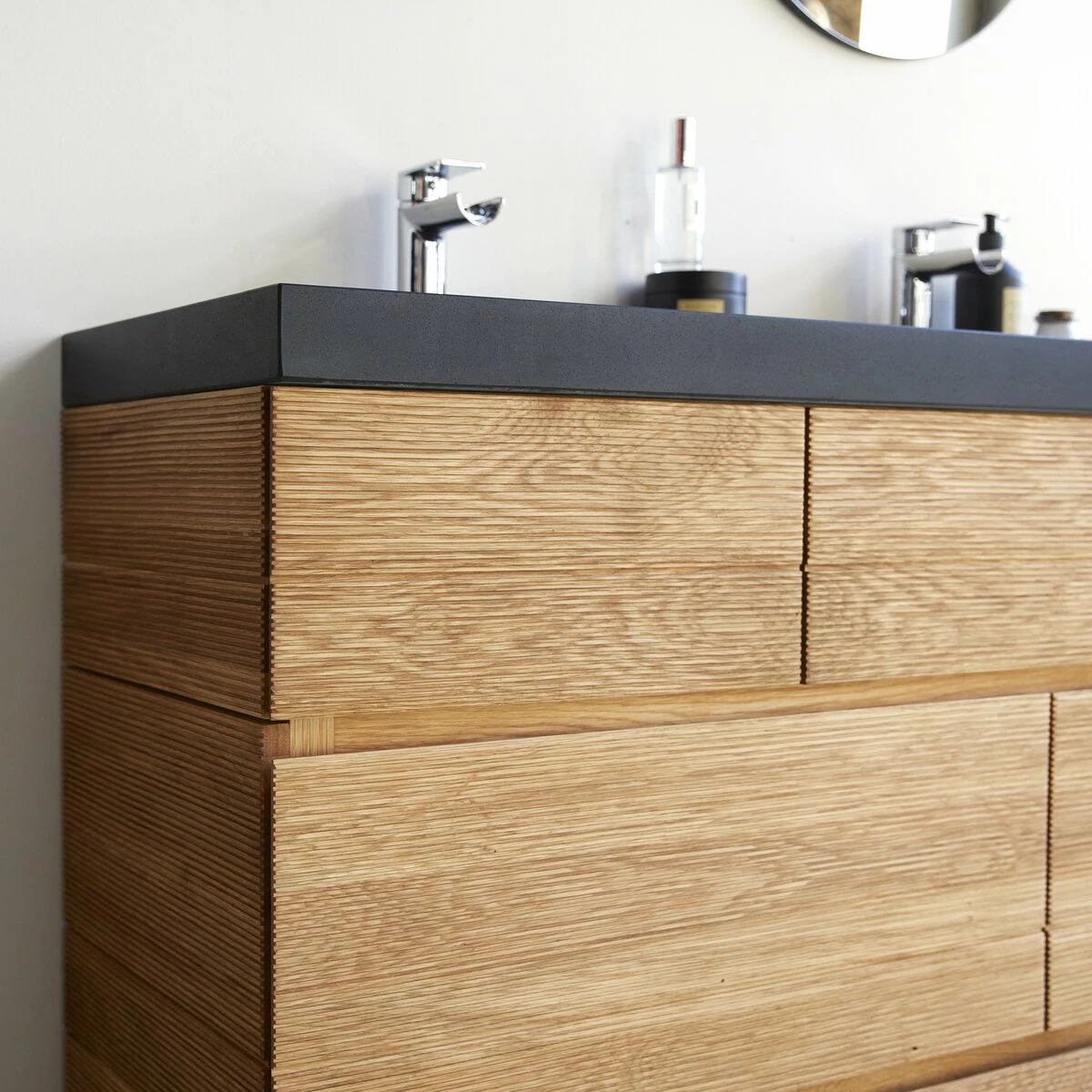 Discover this beautiful double vanity cabinet with a large, integrated lava stone sink. The washbasin is made of solid oak FSC® certified wood and fits perfectly in family bathrooms. The full surface of the lava stone is great for hosting your accessories becauze it is resistant and easy to clean. The washbasin consists of four usable drawers. The upper two are purely decorative. The back surface is open for piping. The unique texture of the oak wood combined with the dark lava stone make this washbasin a classy but simple design piece.