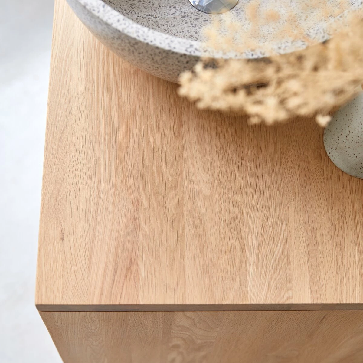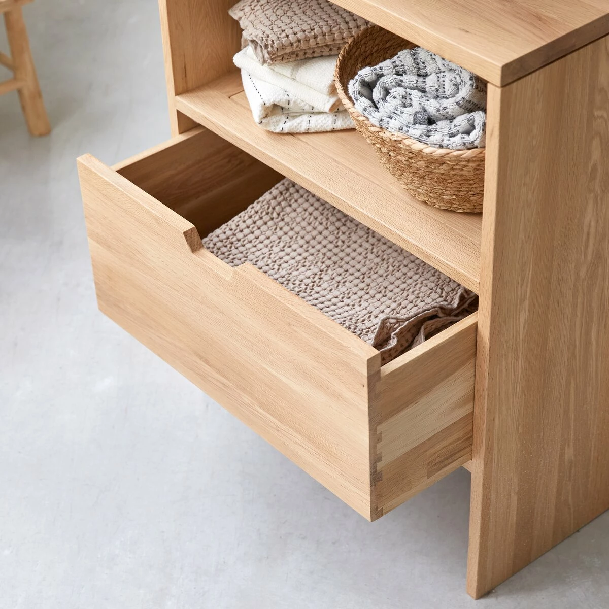 A small, attractive, functional and well-finished unit made from easy-maintenance solid wood, the Kwarto Oak vanity cabinet has everything going for it! It will work equally well in a small bathroom, toilet or wet room. The well-designed unit has a large drawer in which to store anything you don’t want left lying around and a shelf for towels, storage baskets or boxes, or decorative objects.