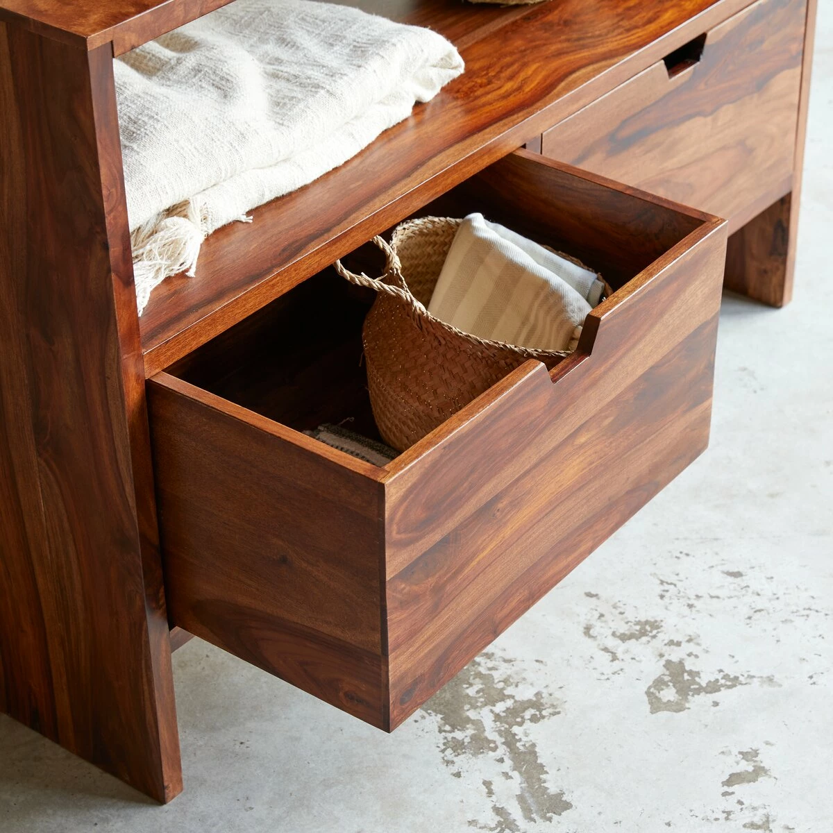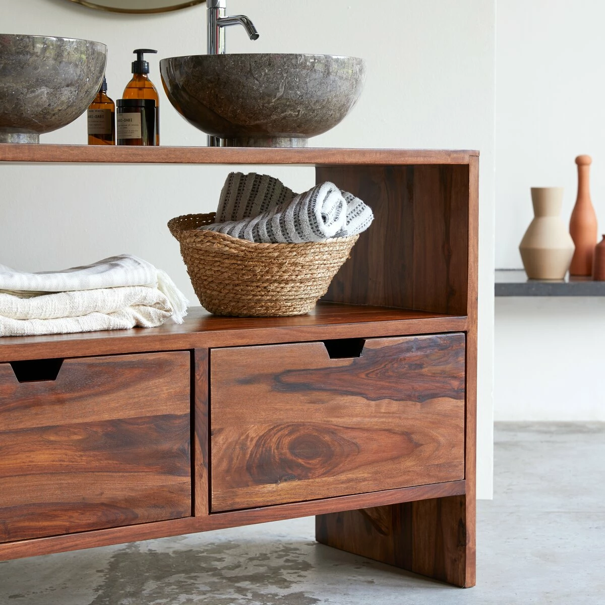 A large sheesham with simple, modern lines. This solid wood washstand comes with 2 box drawers and an open shelf , providing a convenient place to store linens and products.