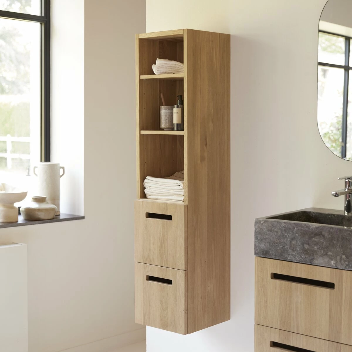 It is made from FSC®-certified solid oak, a guarantee that it is from a sustainably managed forest, and is varnished to withstand everyday life. This contemporary, tall cabinet hangs on the wall, making it super practical: a clear floor is quicker to clean! This cabinet is well-designed with open compartments for displaying your favourite items or stacking towels… and two drawers with ergonomic notched handles to hide all your hygiene products.