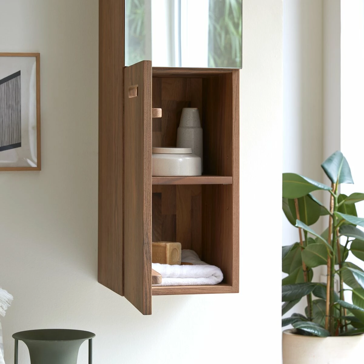 The Line solid walnut FSC® high mirror storage unit is smart, elegant and understated! A very practical two-in-one unit that is wall mounted to occupy minimum space in the bathroom, with a mirror at just the right height. The integrated mirror conceals storage compartments and the bottom door features an ergonomic opening system (a simple slot that you can put your hand through). The generous storage capacity means you can organise your bathroom or loo with style and character. We like the rich colours of the wood and the beautiful grain; it is FSC® certified guaranteeing that it comes from sustainably managed forests, and oiled to make it resistant to moisture. The Line solid walnut high mirror storage unit looks stunning in the bathroom but can also be fitted in a dressing room or a spacious hallway. It is also available in a solid teak version.