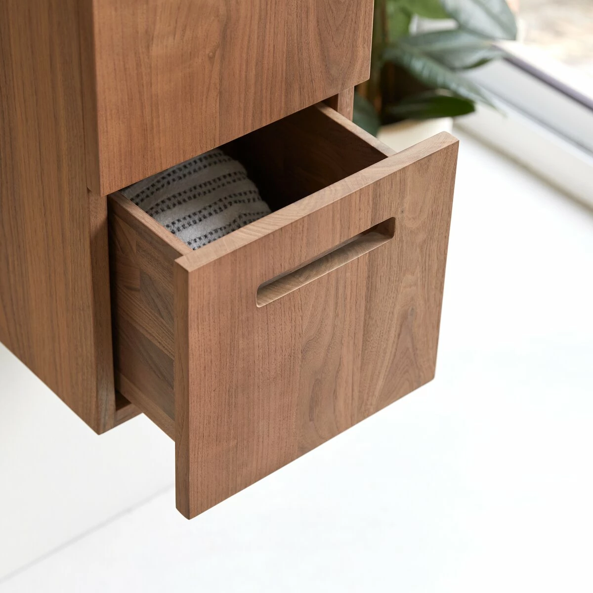 The Line solid FSC® walnut storage unit is an understated piece of furniture that makes the elegant organisation of your bathroom easy. While it’s a great addition to our , it can also be used on its own, combined with existing furniture or with our . The purity of the wall-mounted design make it a storage essential! Depending on how the fancy takes you, you can store towels or bottles in the spacious drawers, and the display the things you like to have within easy reach on the open shelves. This narrow unit takes up very little space but is really useful. The Line solid walnut high storage unit is a boon in any bathroom, but is equally useful in a loo, a bedroom or an office.Please note, the original design for opening the drawers.