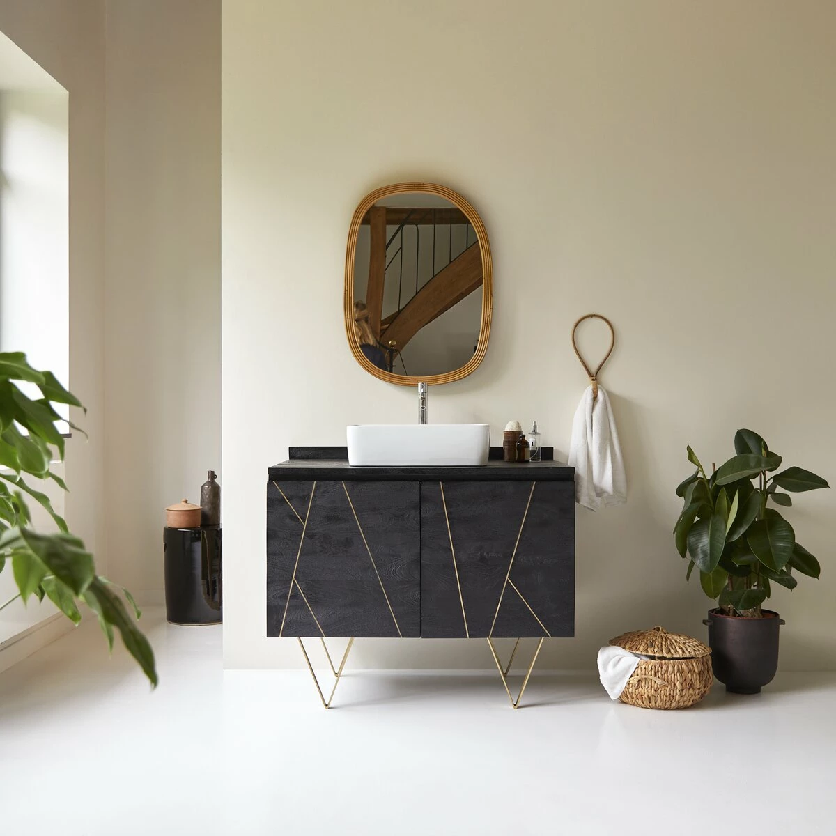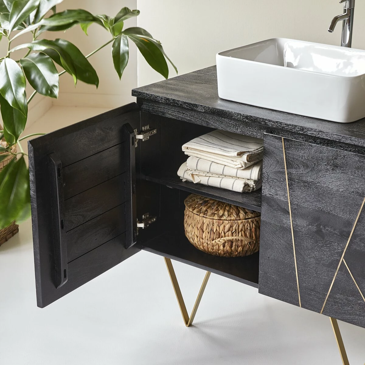 The Liv collection can boost your sense of wellbeing with its stylish but functional design. You will love the contrast of the coloured mango solid wood ,combined with Art Deco facades. The gold metal touches bring refinement and character to your bathroom! Meanwhile, the brass-coloured painted metal feet have a chic, elegant look