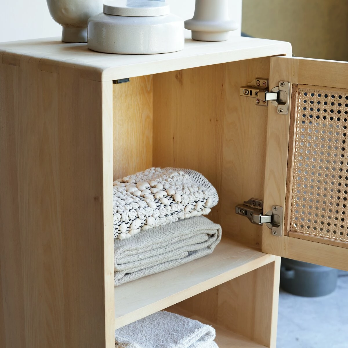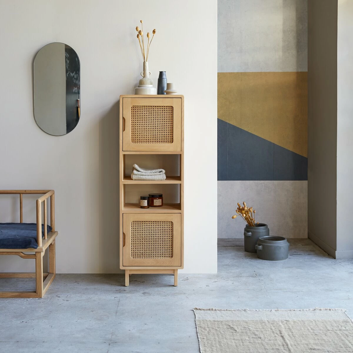 The charm of a slightly vintage look, the nobility of natural materials, the attraction of soft modern lines… a storage essential that offers many irresistible features. This incredibly useful high cabinet is an elegant storage solution and the key to a tidy bathroom.