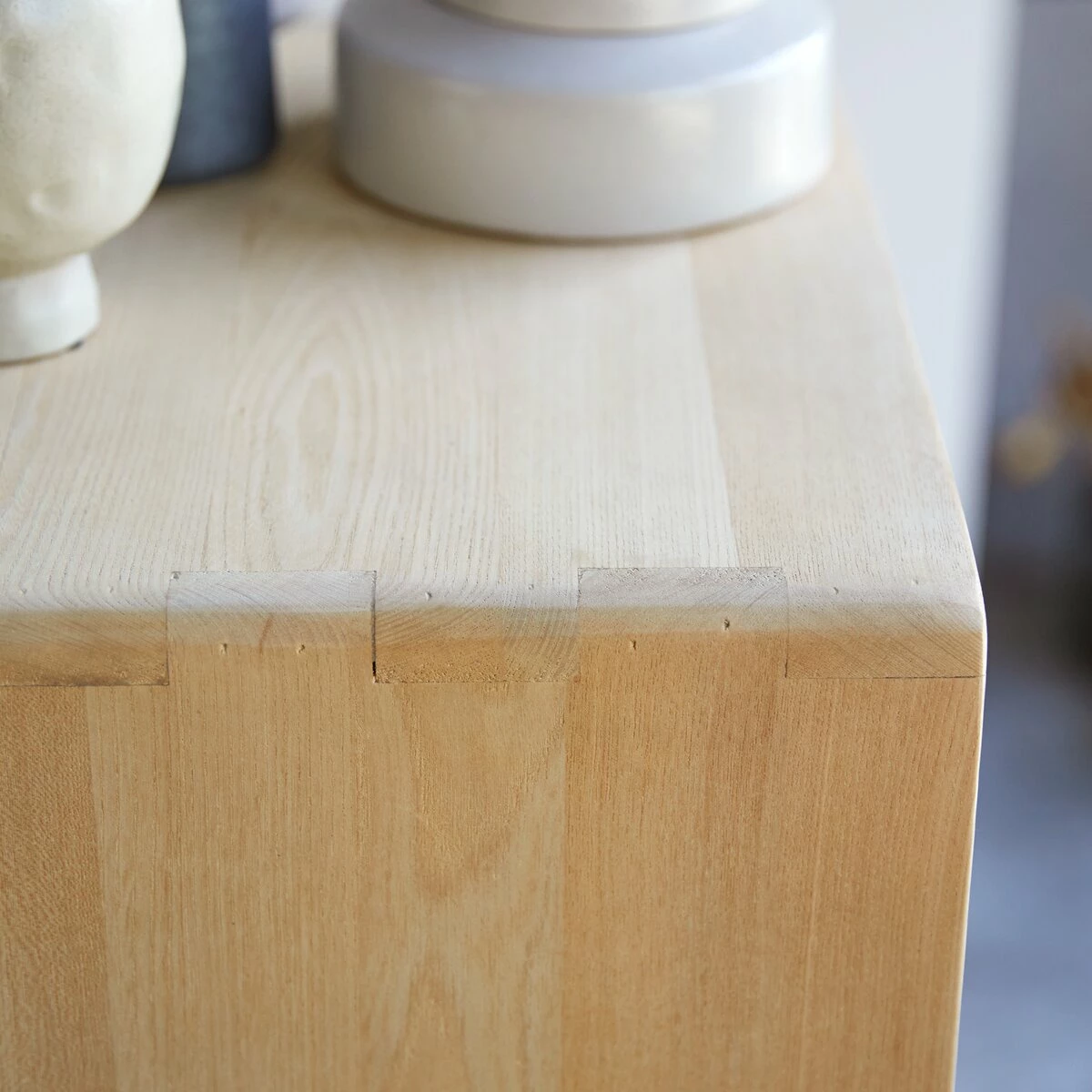 The Luis high cabinet in solid elm and canework is treated with oil and assembled with a traditional box joint construction.