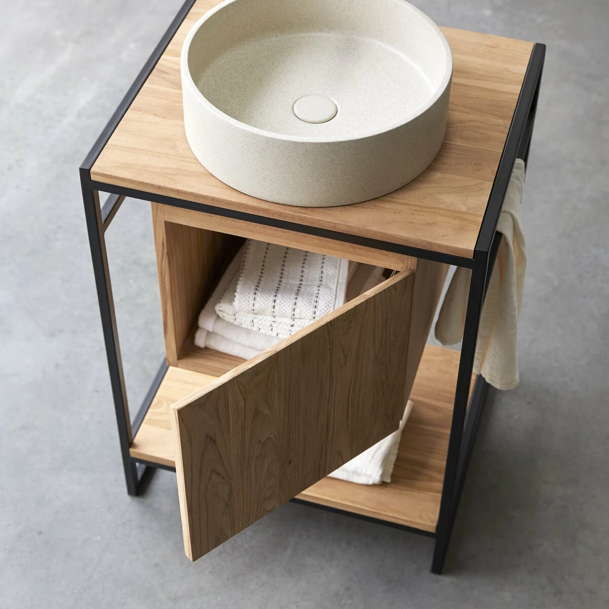 Bring an urban touch to your bathroom with the Michal vanity cabinet in metal and teak FSC® certified. Its contemporary design is characterised by the light toned teak wood and the black painted metal. These make an elegant and graphic combination.
