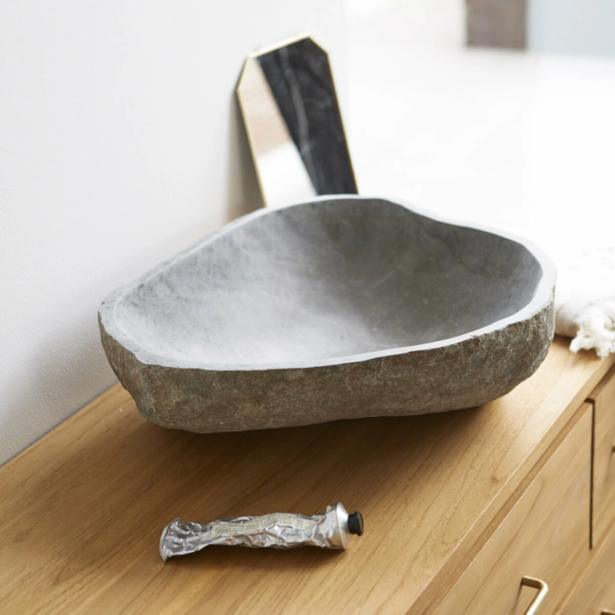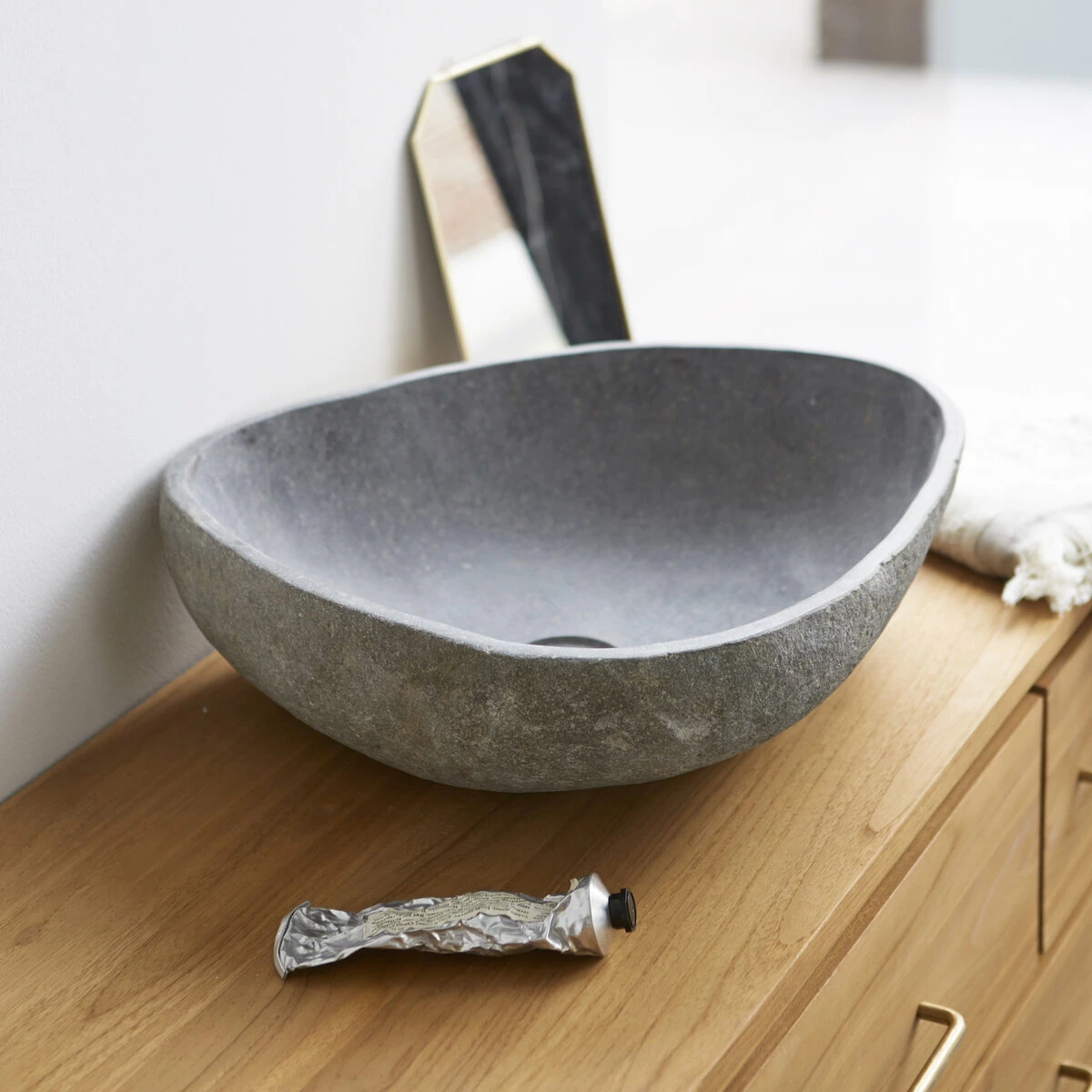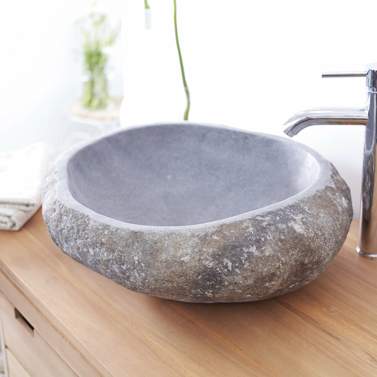 The Galet Nobu river stone washbasin is the ideal way to bring a relaxed feel to and offers both authenticity and elegance. Because it is cut from solid natural stone whose original form has been preserved, this basin is unique. The exterior is deliberately left unfinished, while the interior is smoothed for easy cleaning. The distinctive charm of this river stone basin creates a natural ambience and helps make your bathroom a place to pamper yourself.