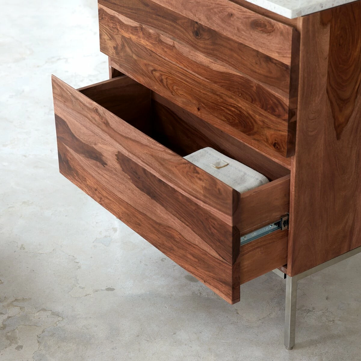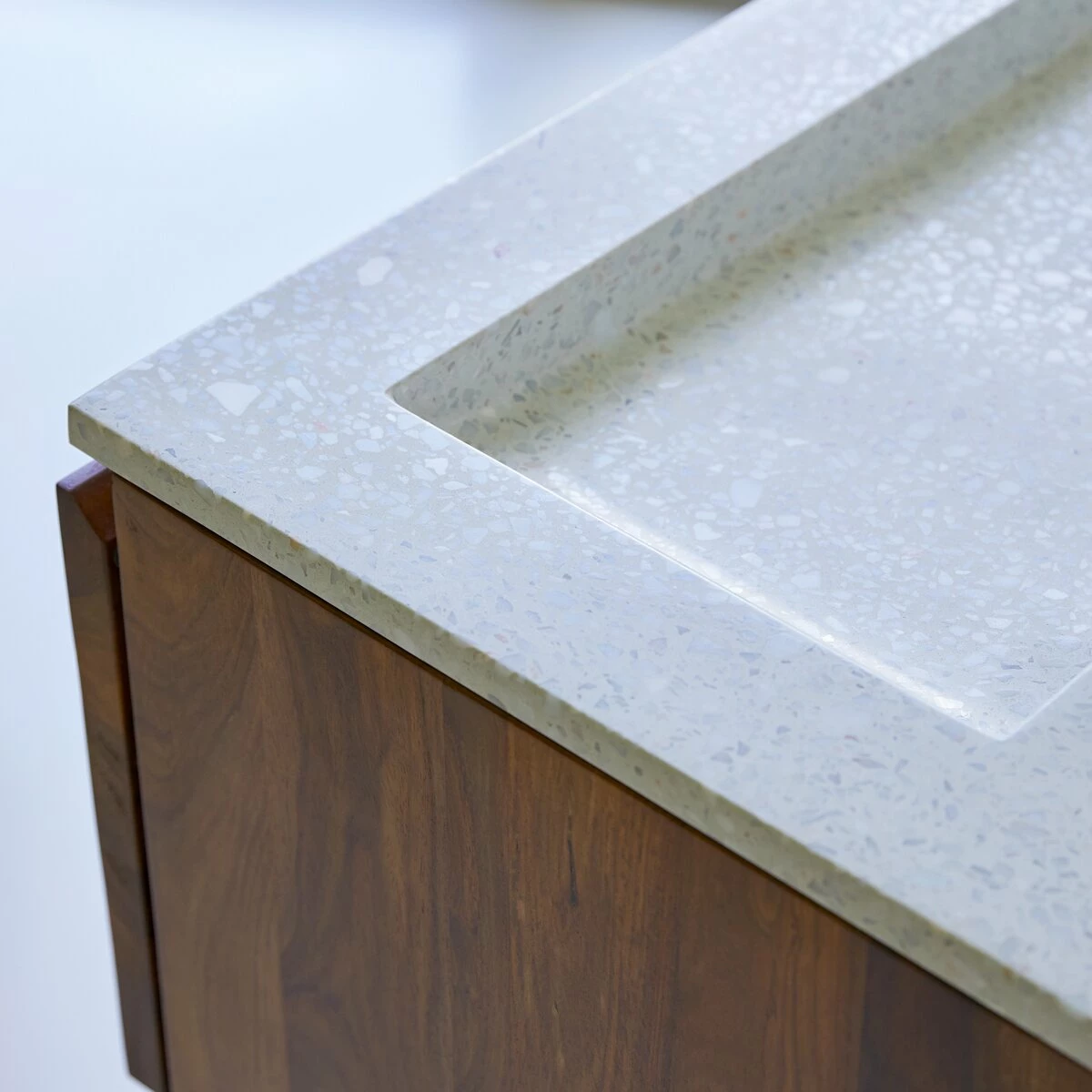 The Nova solid rosewood vanity unit has two very spacious drawers for storing towels, accessories and other items that you don’t want cluttering up your bathroom. It is also available in a or combined with a Pink premium terrazzo washbasin in an or width.