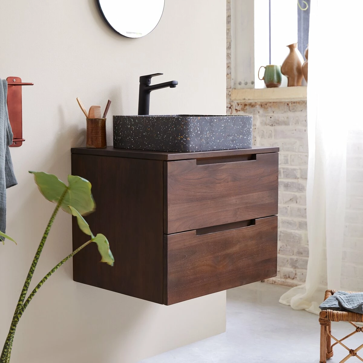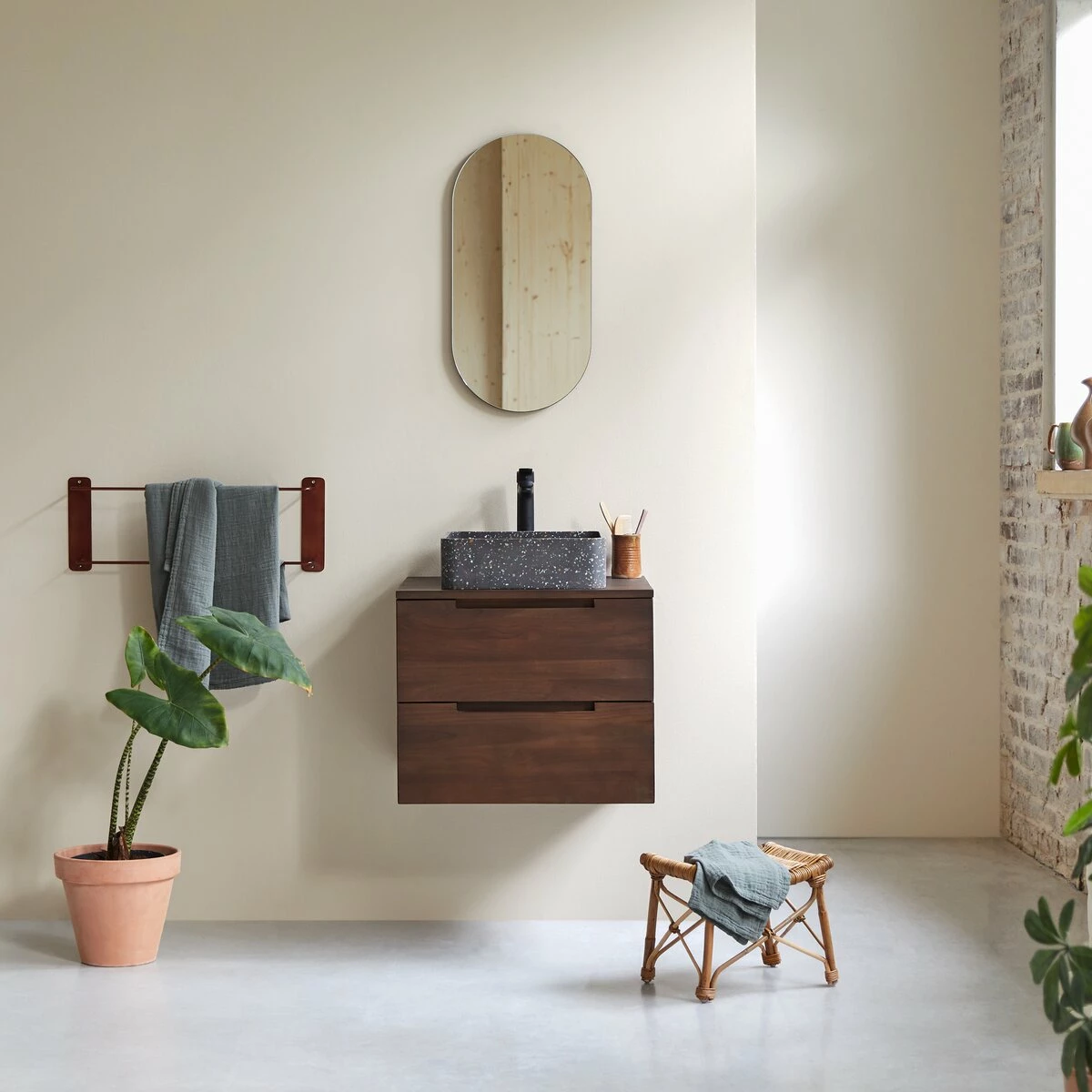Romeo suspended solid teak wash unit 60… Just wow! In addition to its modern design and rich colour, this attractive unit is very practical and fits well . The two drawers can be used to store hand and bath towels as well as beauty products that you don’t want to see lying around in the bathroom.