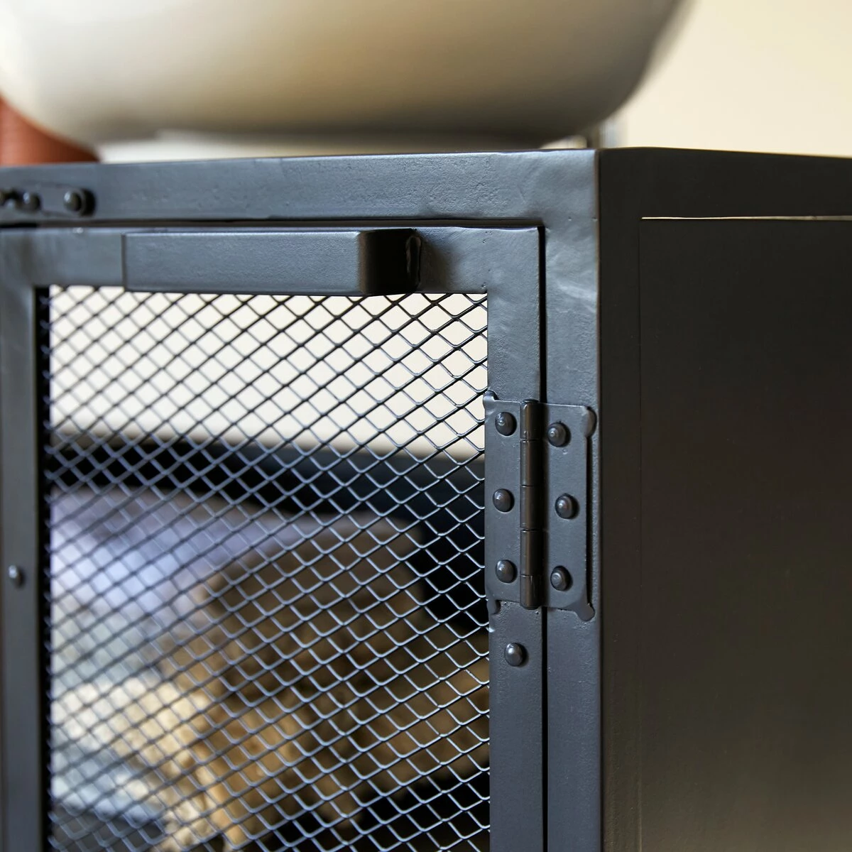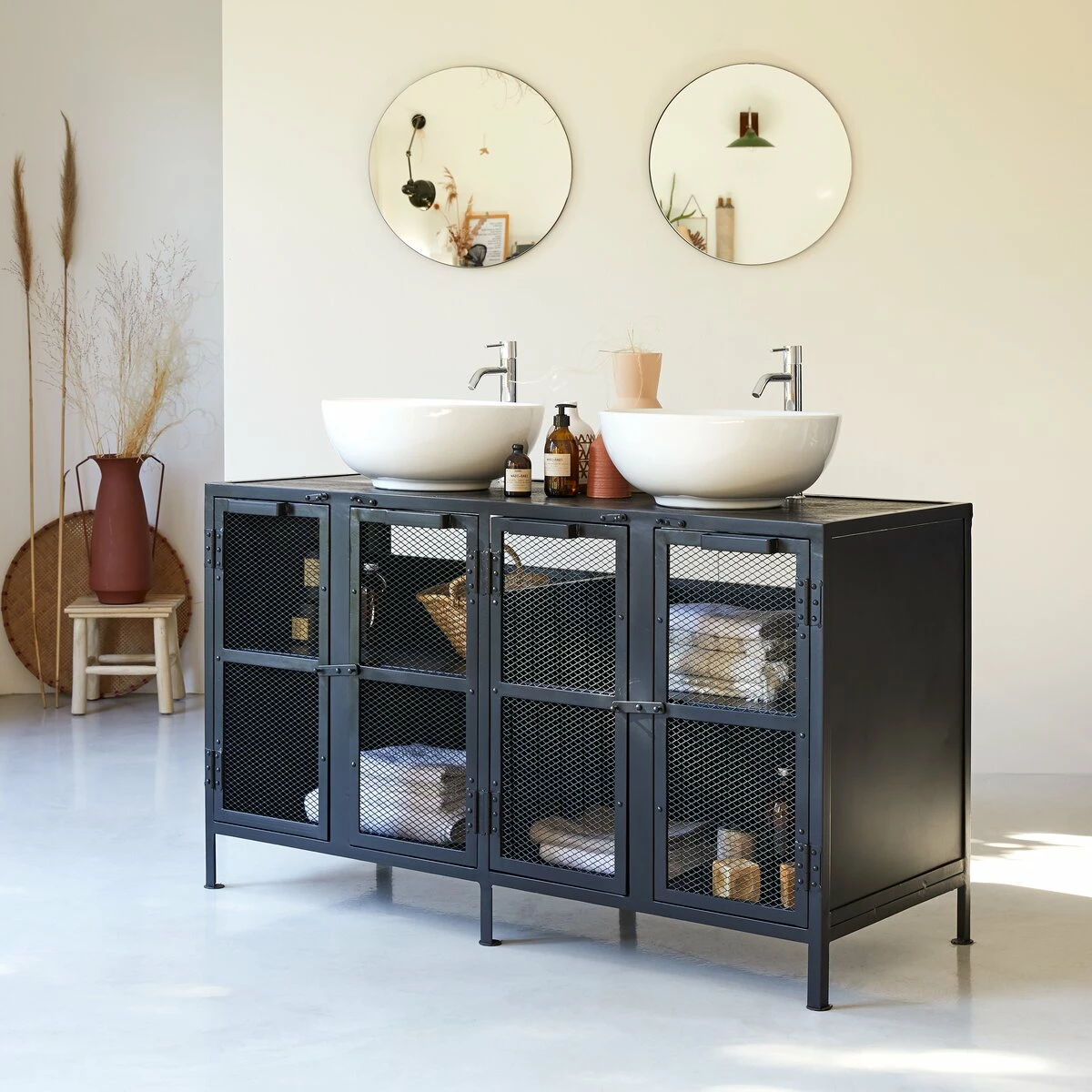 The Romy vanity unit in metal and solid mango wood offers all the features of a piece of furniture inspired by the New York workshops of the early twentieth century: we love the combination of materials, the wire mesh doors like those of the food safes used at the time, as well as the very industrial lines.