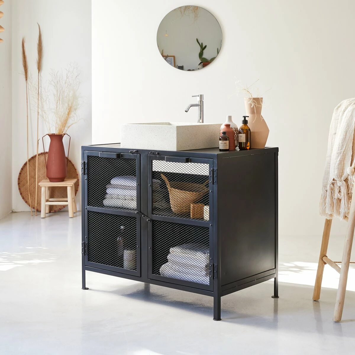 Inspired by early 20th-century New York lofts, it will give your bathroom heaps of character! Even the most minimal bathrooms will get an updated look. We particularly like the combination of two seemingly very different materials (the solid wood of the top and the metal used for the rest of the cabinet) and the wire-mesh doors, which add to its vintage appeal.