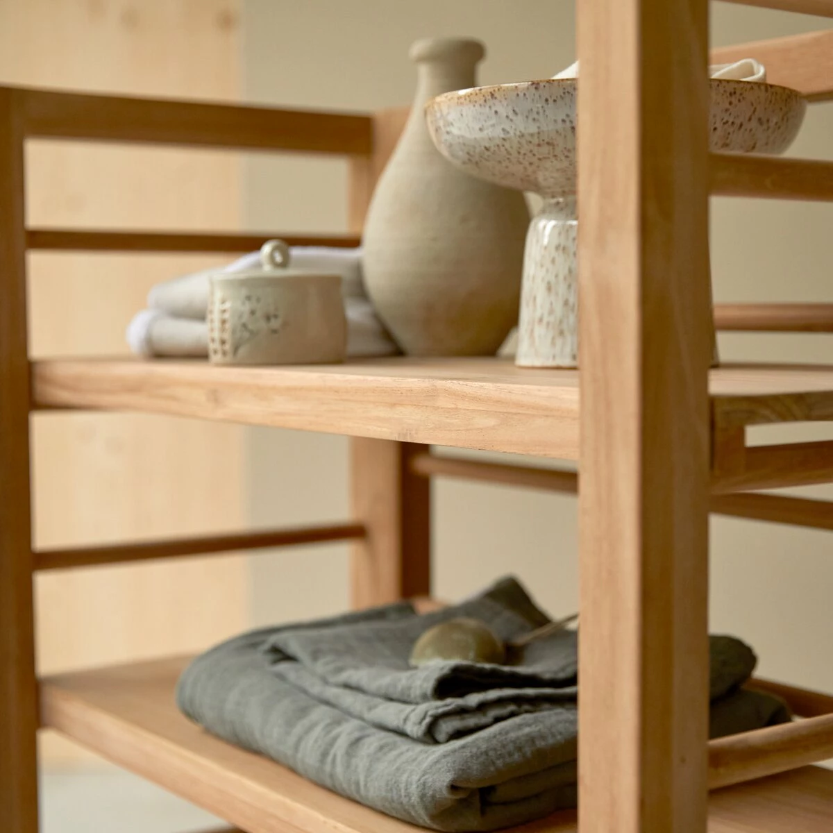 The Sera solid teak bathroom shelving unit (80 x 115 cm) may be small but it’s incredibly versatile: you can use it to store towels, beauty products, shampoos, accessories… you can also display on it to personalise your space. Depending on the size of your bathroom, you could double it up and have one unit for towels and the other to display accessories, perfumes, etc. The shelves are easy to fit at the height you want. The Sera teak bathroom unit is super handy at bath time but it can just as easily become . It successfully expresses the “natural spirit” of our products as well as the furniture ranges in .