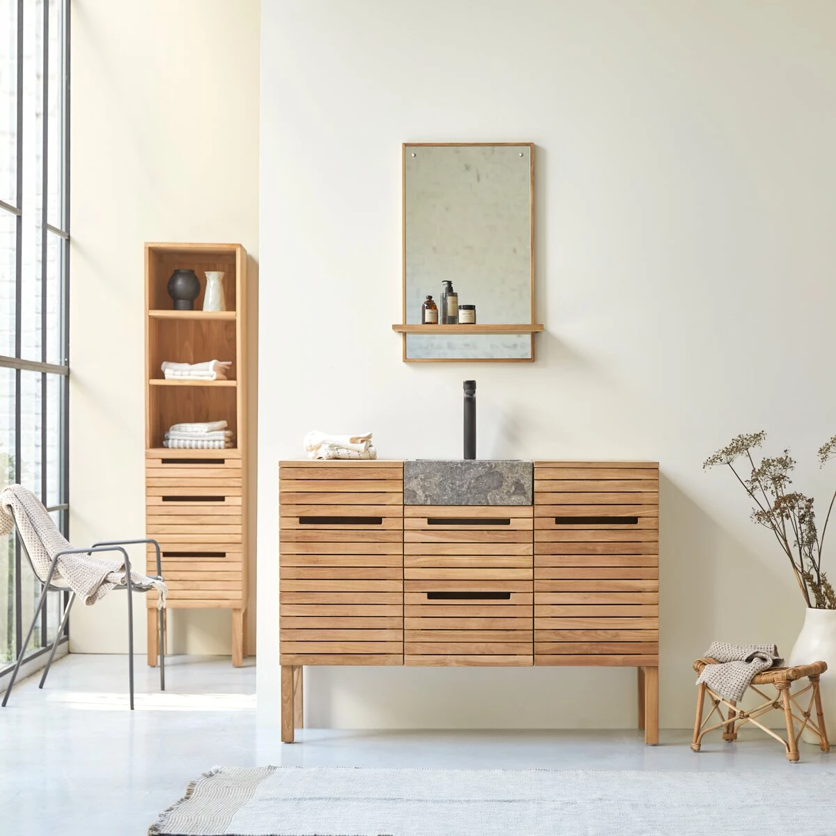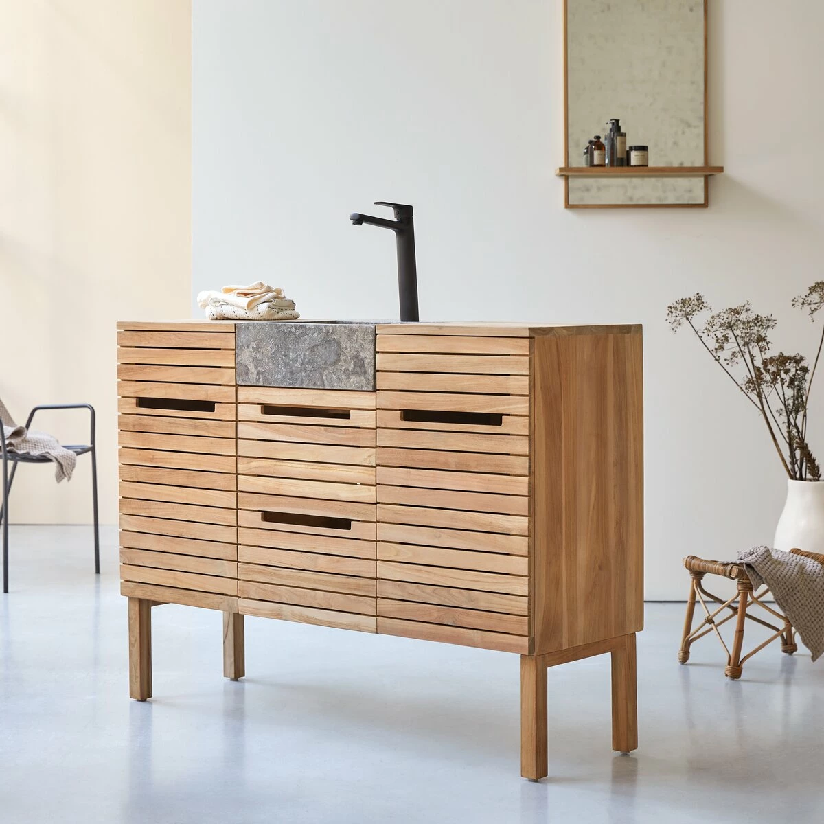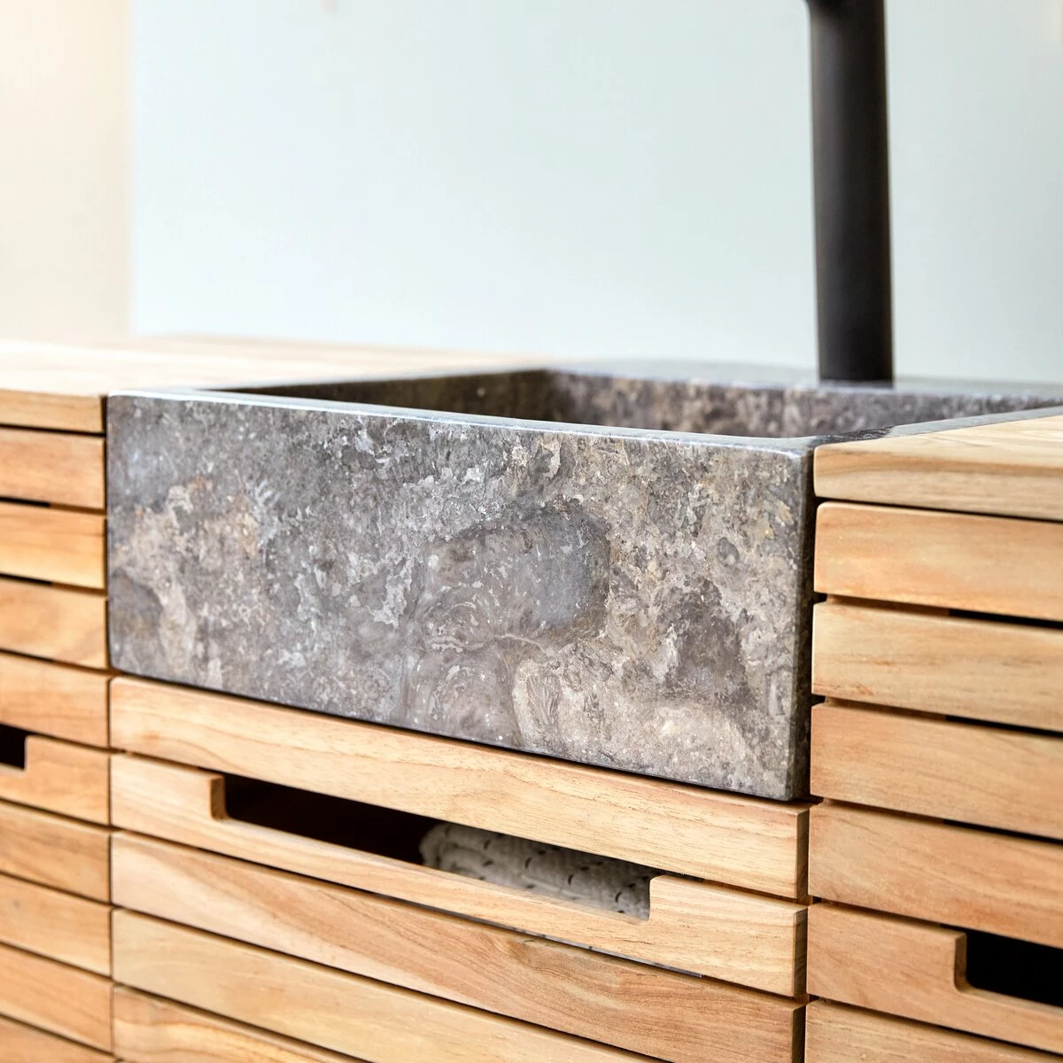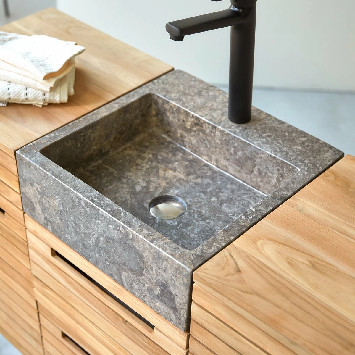 A trendy design made from beautiful materials. The natural, elegant look of the waterproof solid teak and the refinement of the marble make the Slats 122 a beautiful piece of furniture! You will love the slatted cupboard doors, the ergonomic handles (a simple slot allows the hand to pass) and the size of the generous storage spaces. The marble basin is placed on two drawers and nestled between 2 storage columns.