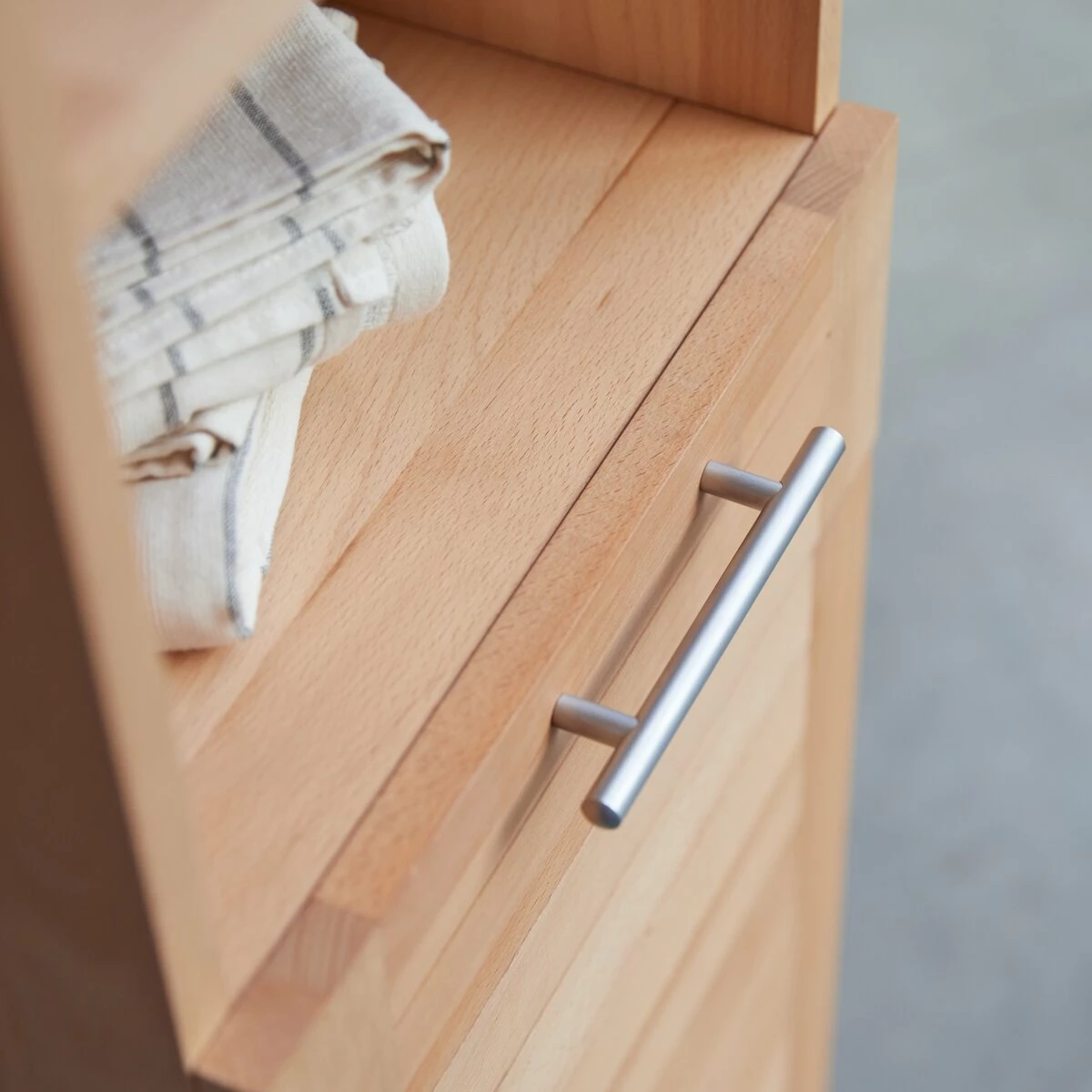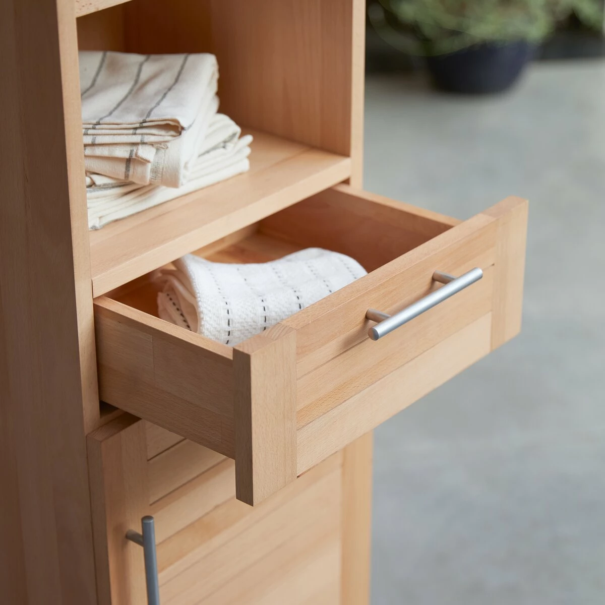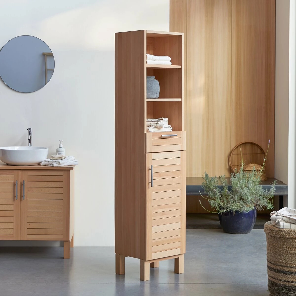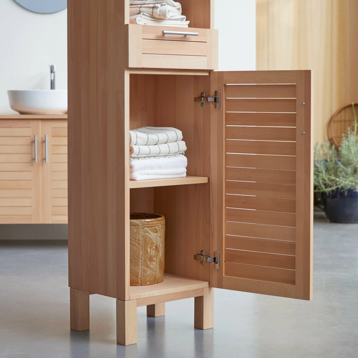 The Soho tall solid beech bathroom cabinet: space-saving and well-designed in terms of storage capacity! The compartments are designed to hold those things we like to have within easy reach, the cupboards offer room for towels… and the drawer is great for tidying away small accessories that we don’t want to see cluttering up the room. Ideal for complementing the other furniture in , this tall solid beech bathroom cabinet combines natural elegance with a slatted finish that is so sought-after in contemporary interiors. We like the honey colour of the FSC® certified wood, your guarantee that it comes from responsibly managed forests, and has been treated with oil to nourish and protect it deep down.