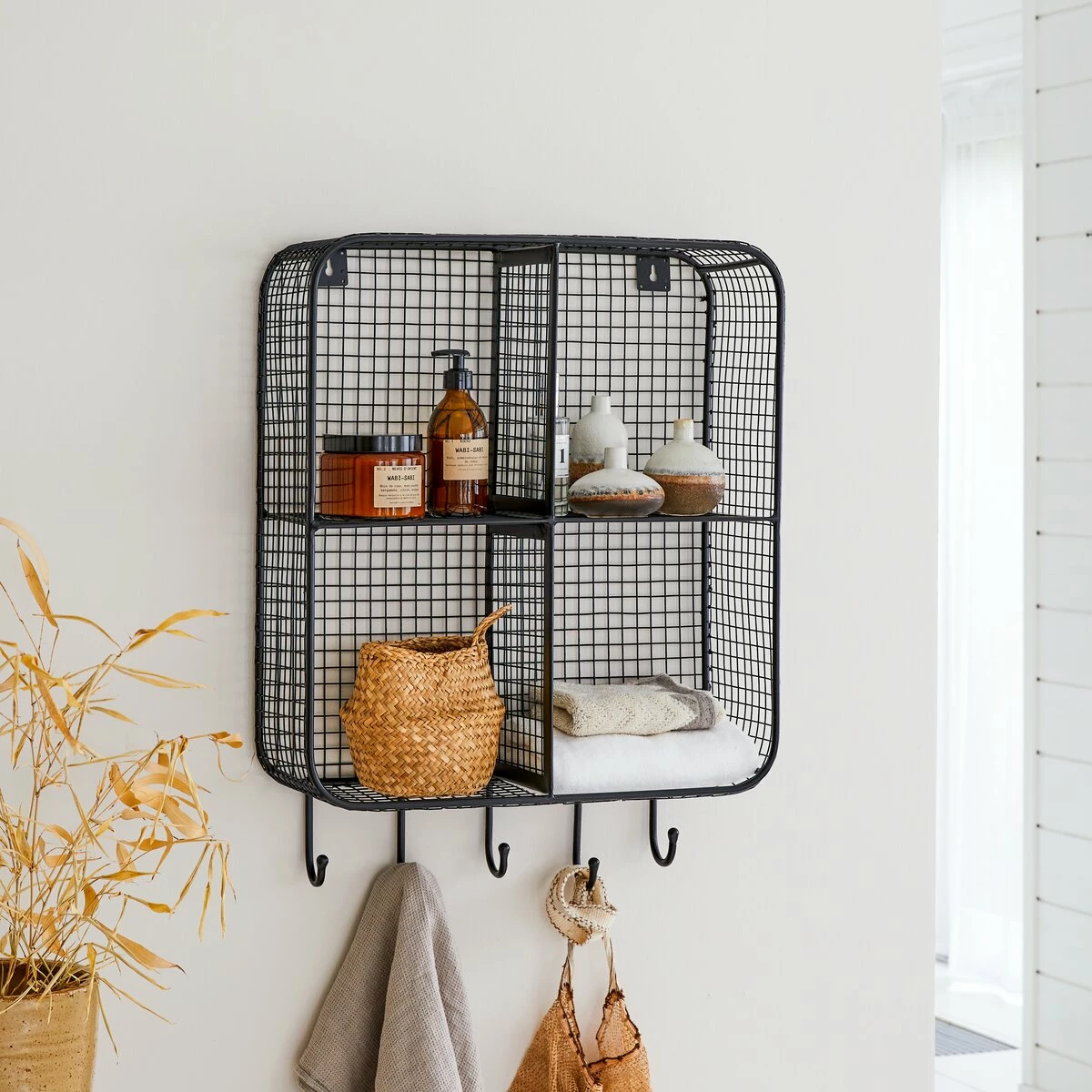 Its design is characterised by the grill look and squared lines. Practical and stylish, this unit is separated into 4 separate compartments that can help to keep items close to hand. It also has 5 hooks, which are great for hanging towels and other linens.