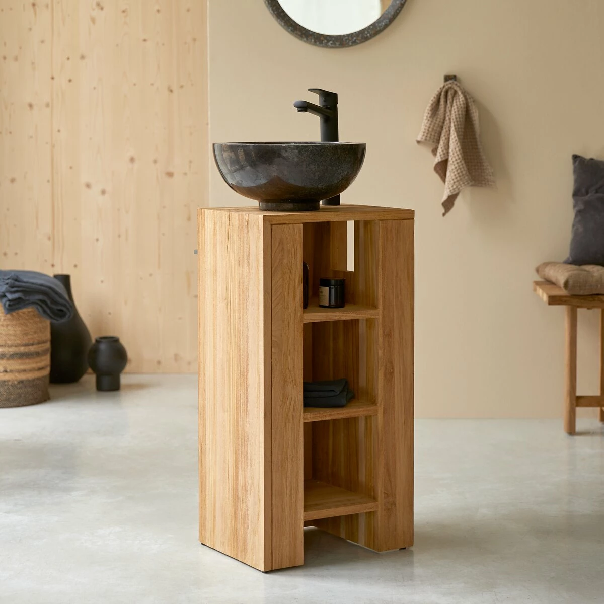 Ideal for any size of bathroom, thanks to its slimline, upright design, this washstand can help you to bring some modern style to your bathroom, while opimising the space. The lovely, warm graining in the teak wood and softly sanded edges provide the homely character, while the 3 shelves and brass towel bar form discrete, tidy places to store your bathroom accessories.