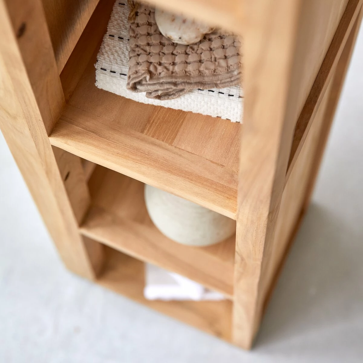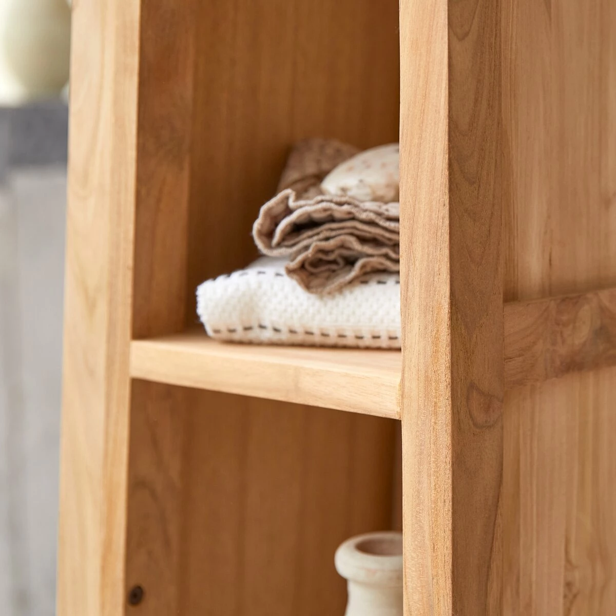 An elegant, FSC® certified solid teak storage column, fronted with a mirror. The simple, modern design can help to make your a place of serenity and well being. Also practical and functional, it has a handy mirror on the side and is equipped with 4 levels of cupboard storage, for optimal organisation of your bath linens.